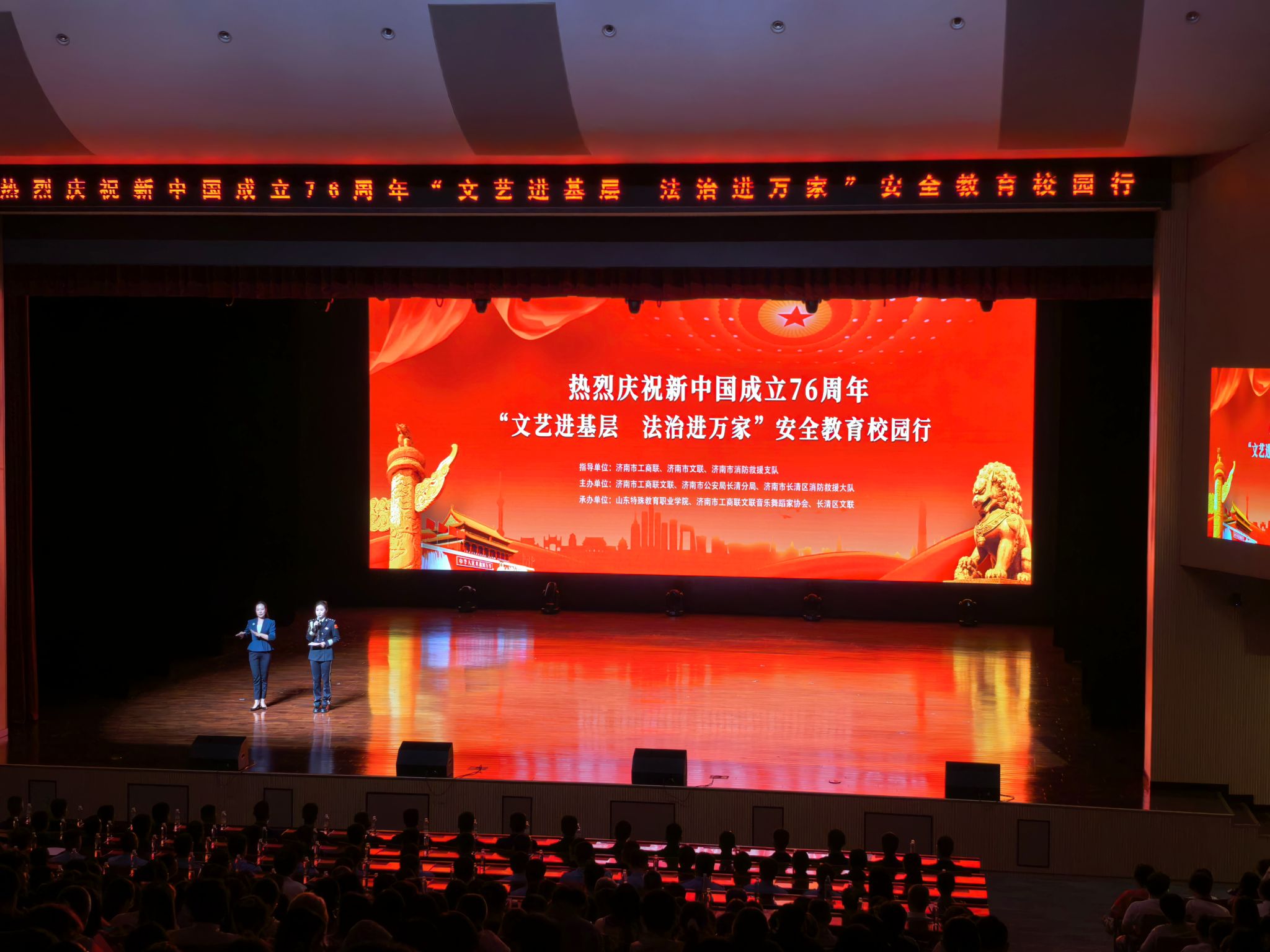 9月25日,由济南市工商联、市文联、济南市公安局长清分局、长清区消防救援大队共同组织的“‘开拓进取 砥砺前行’庆祝中华人民共和国成立76周年暨普法教育安全行”文艺演出活动在学院隆重举行。济南市工商联、市文联、济南市公安局长清分局、长清区消防救援大队分管负责同志,长清区政府有关负责同志,学院领导出席。