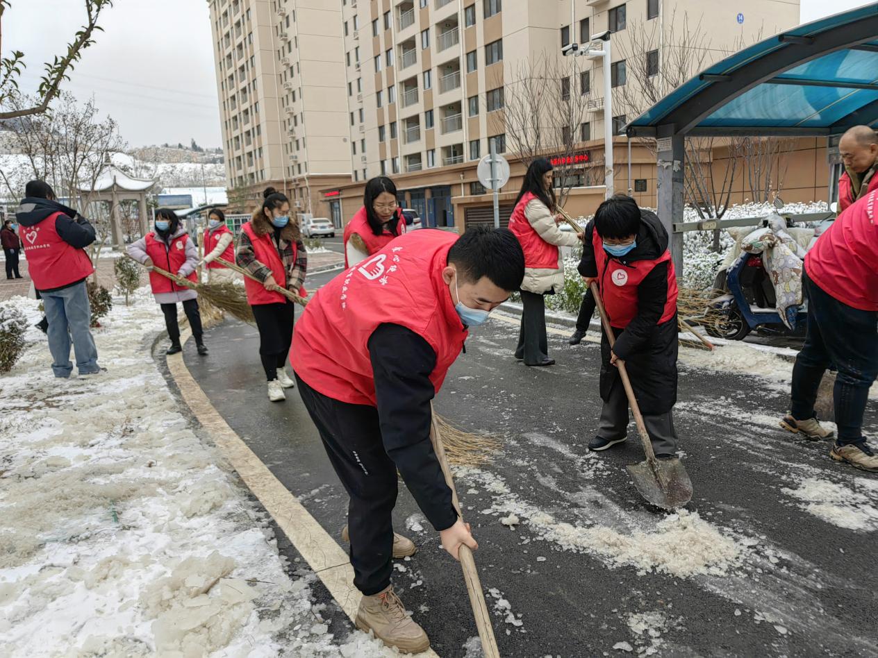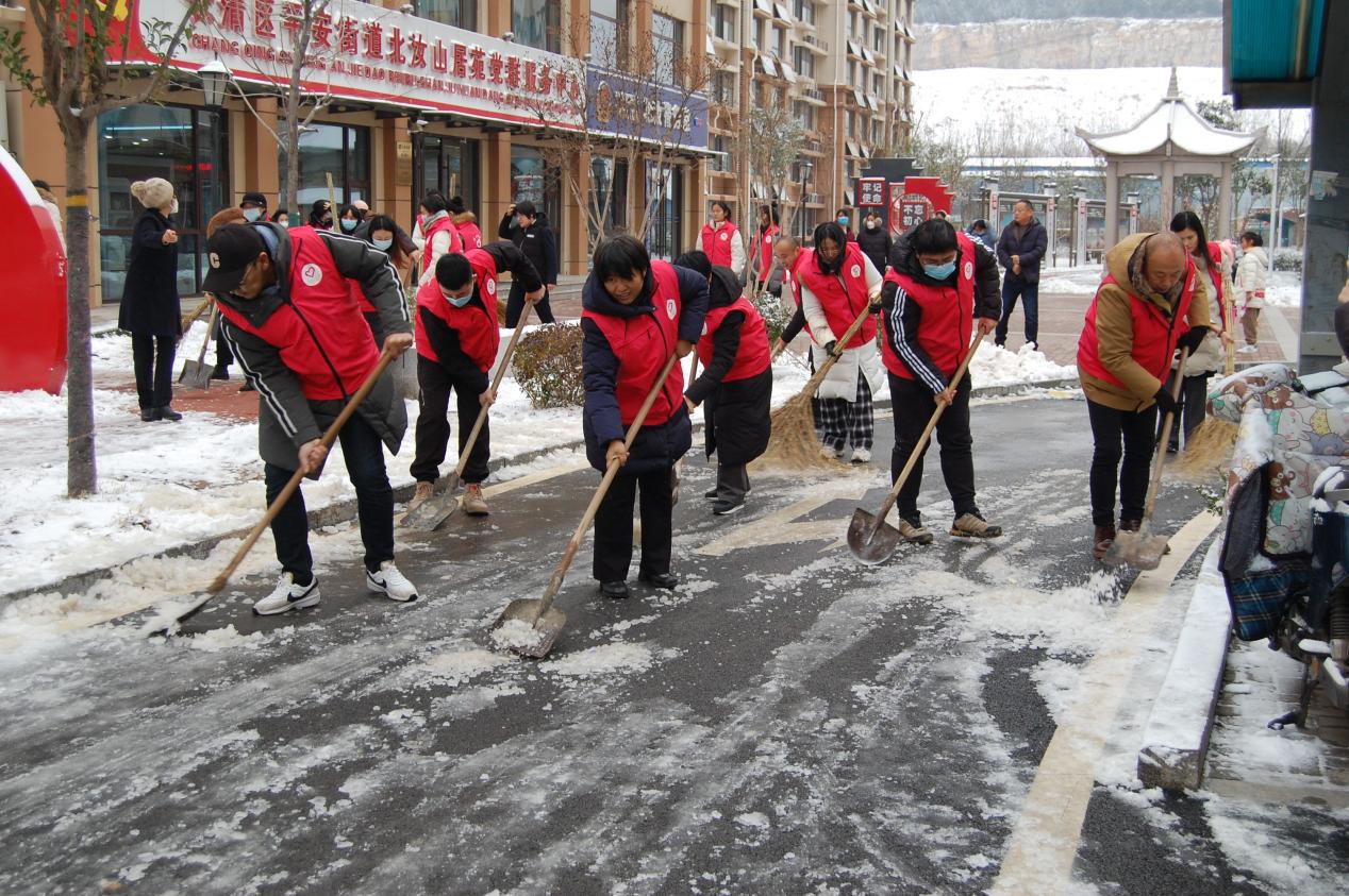 活动开始前,三个支部的党员穿上“红马甲”,带上扫帚、铁铲等工具对社区覆盖在路面、台阶等地的积雪进行清扫。志愿者们分工合作,干劲十足,共同努力将社区道路积雪清扫干净,消除了雪天路滑的安全隐患,保障社区居民出行安全。