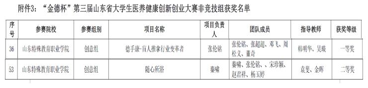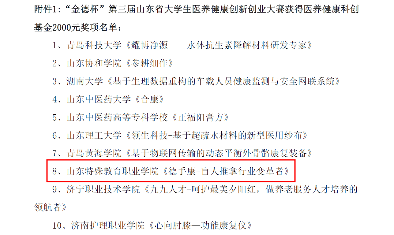 近日,在第十四届山东省大学生科技节——“金德杯”第三届山东省大学生医养健康创新创业大赛中,我院《德手康——盲人推拿行业变革者》《随心所浴》两个参赛项目分别获得一等奖和二等奖,《德手康——盲人推拿行业变革者》获得医养健康科创基金2000元。