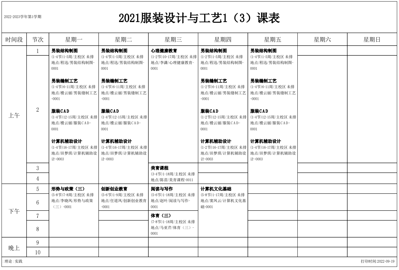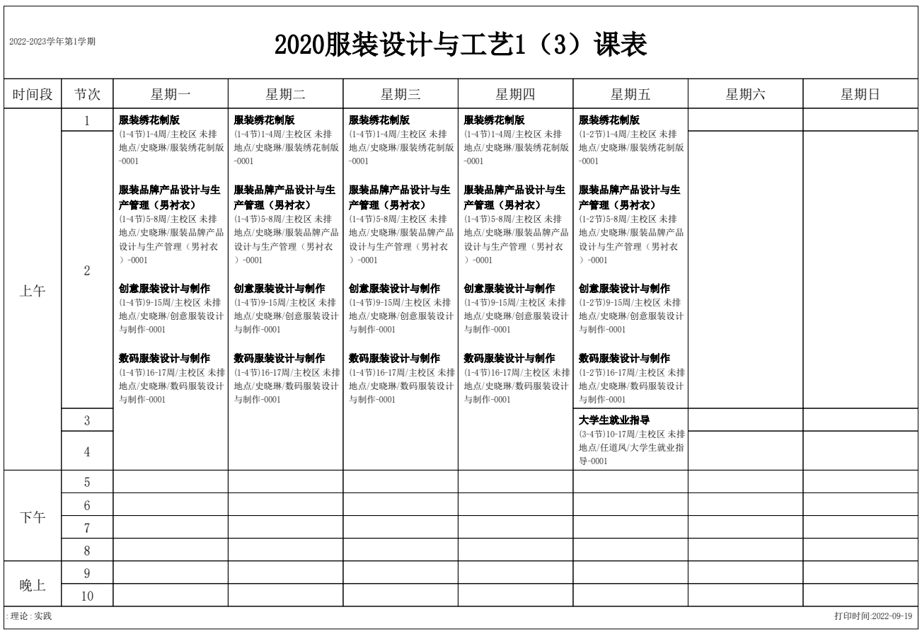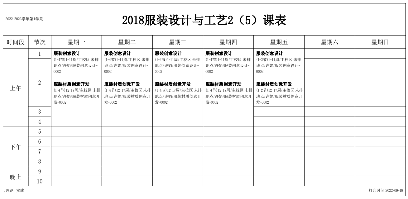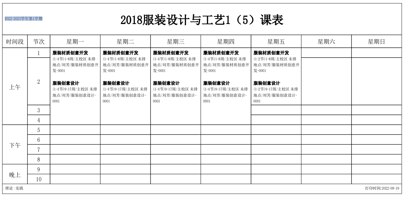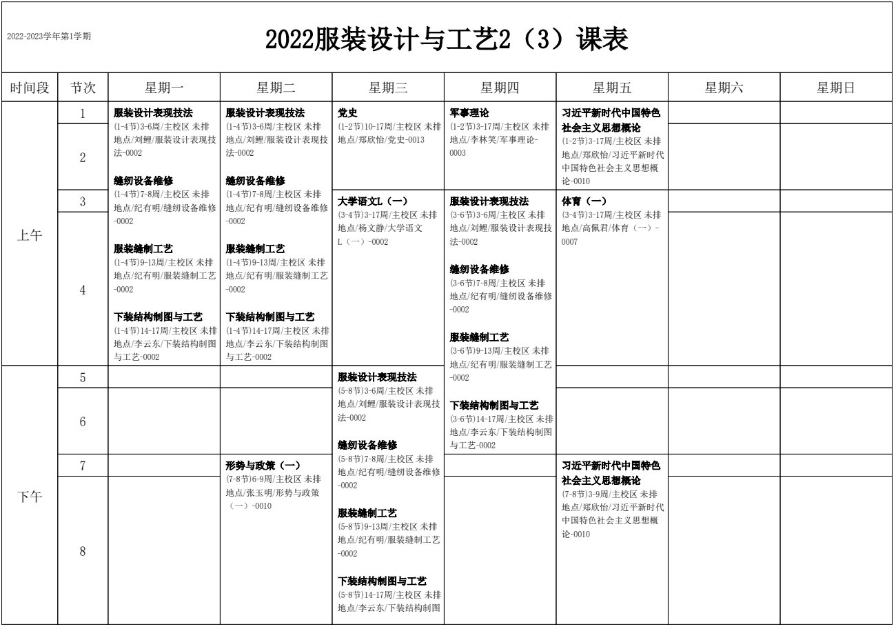 2022-2023学年第1学期 服装艺术系课表