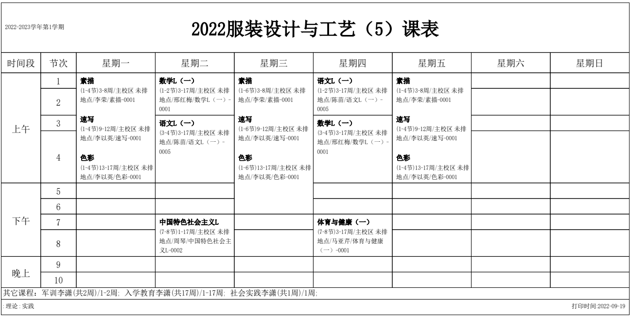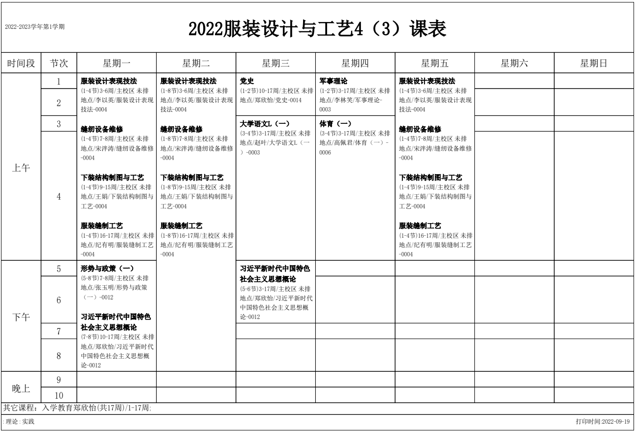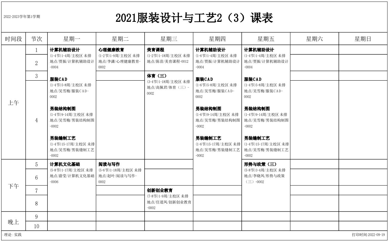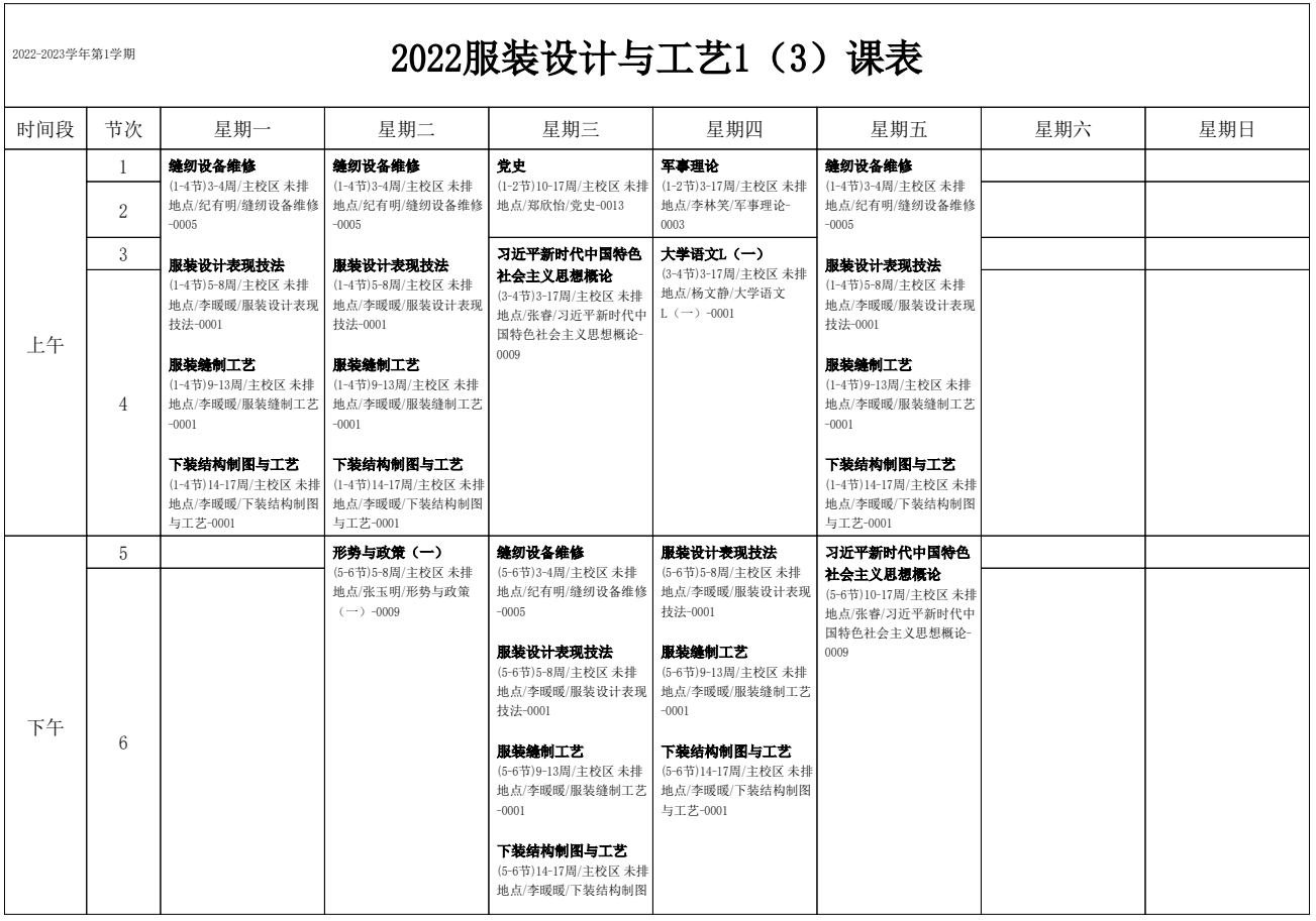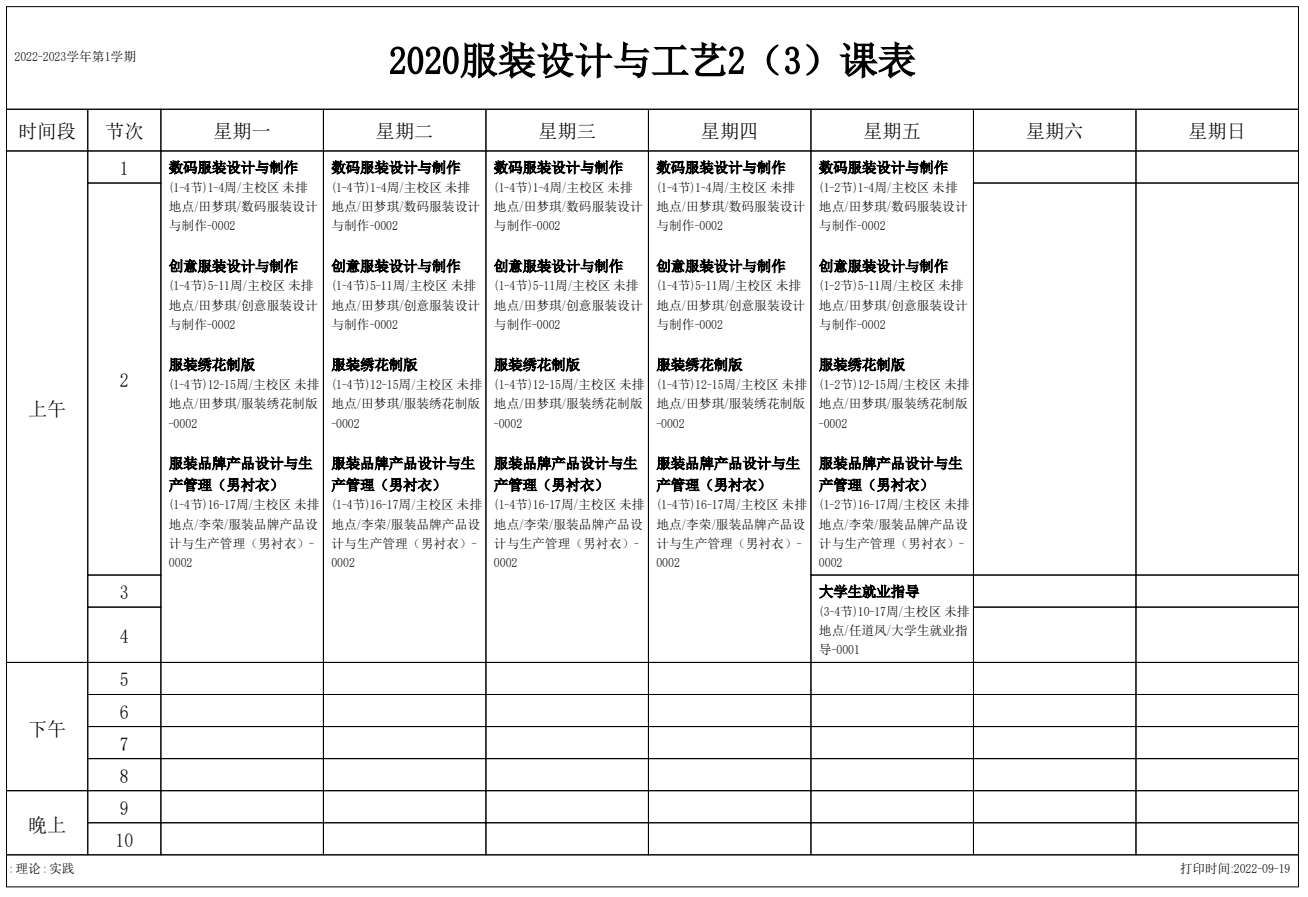 2022-2023学年第1学期 服装艺术系课表
