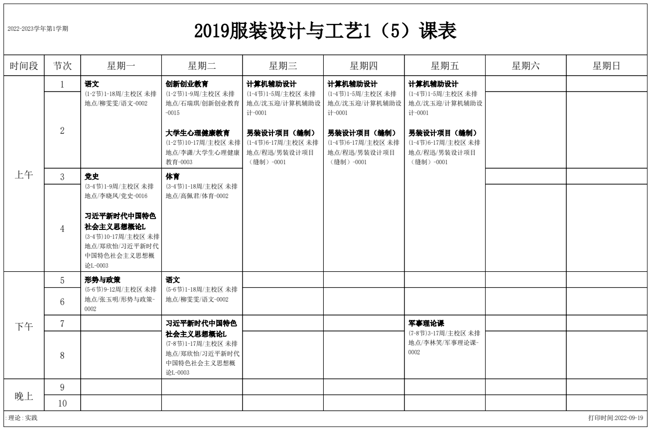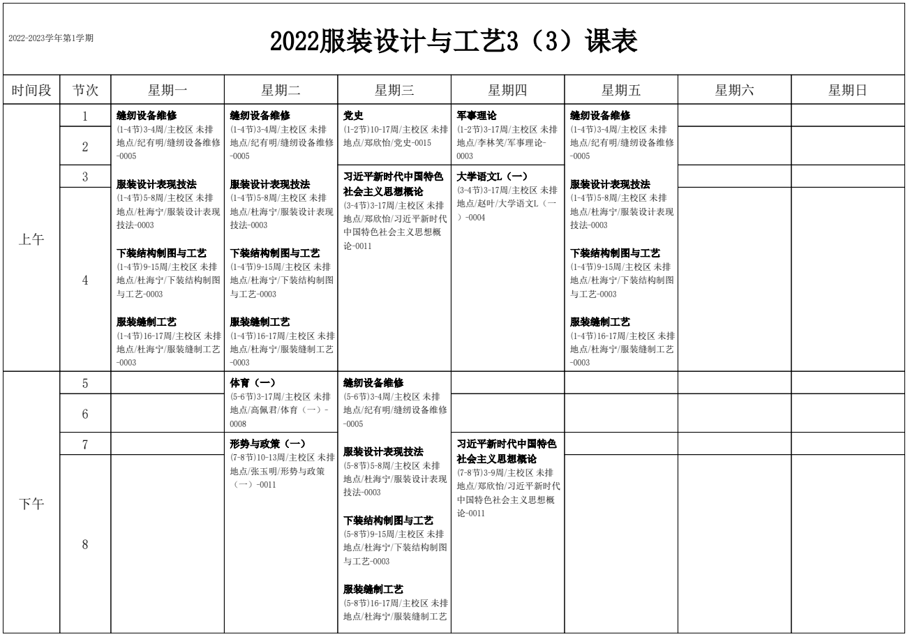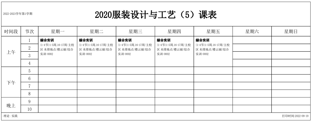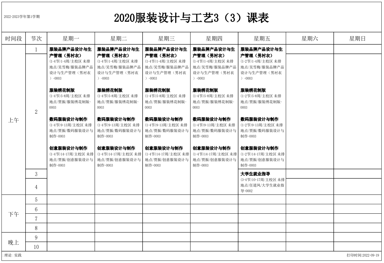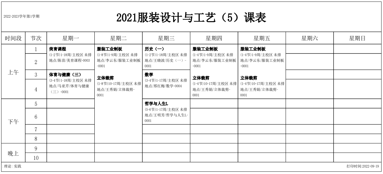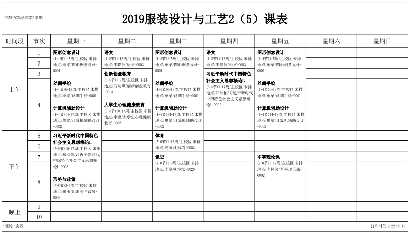 2022-2023学年第1学期 服装艺术系课表