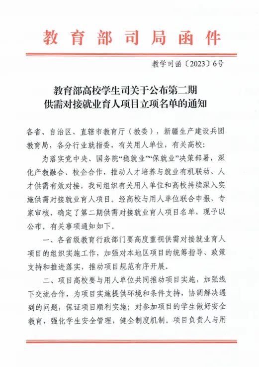 供需对接就业育人项目是教育部高校学生司落实党中央、国务院稳就业、保就业决策部署,深化产教融合、校企合作,推动人才培养与就业有机联动、人才供需有效对接的重要举措。供需对接就业育人项目分为定向人才培养培训项目、就业实习基地项目、人力资源提升项目、重点领域校企合作项目共四类。其中,定向人才培养培训项目由用人单位与高校协同制定培养方案,实施长期系统定向培养或短期就业能力培训,为用人单位输送急需紧缺人才。