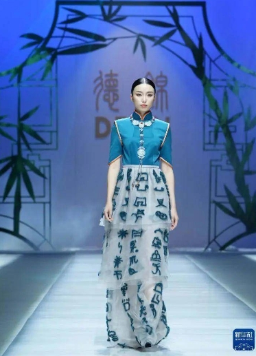 “尚方”发布会上,宋泮涛教授指导苏金环、苏银环将古老的纳西族东巴象形文字以中国画的形式,通过山东鲁绣、剁绣等技艺精心制作了四件东巴文绣花裙摆,把古老的民族文化和悠久的非遗艺术带上了国际时尚舞台。