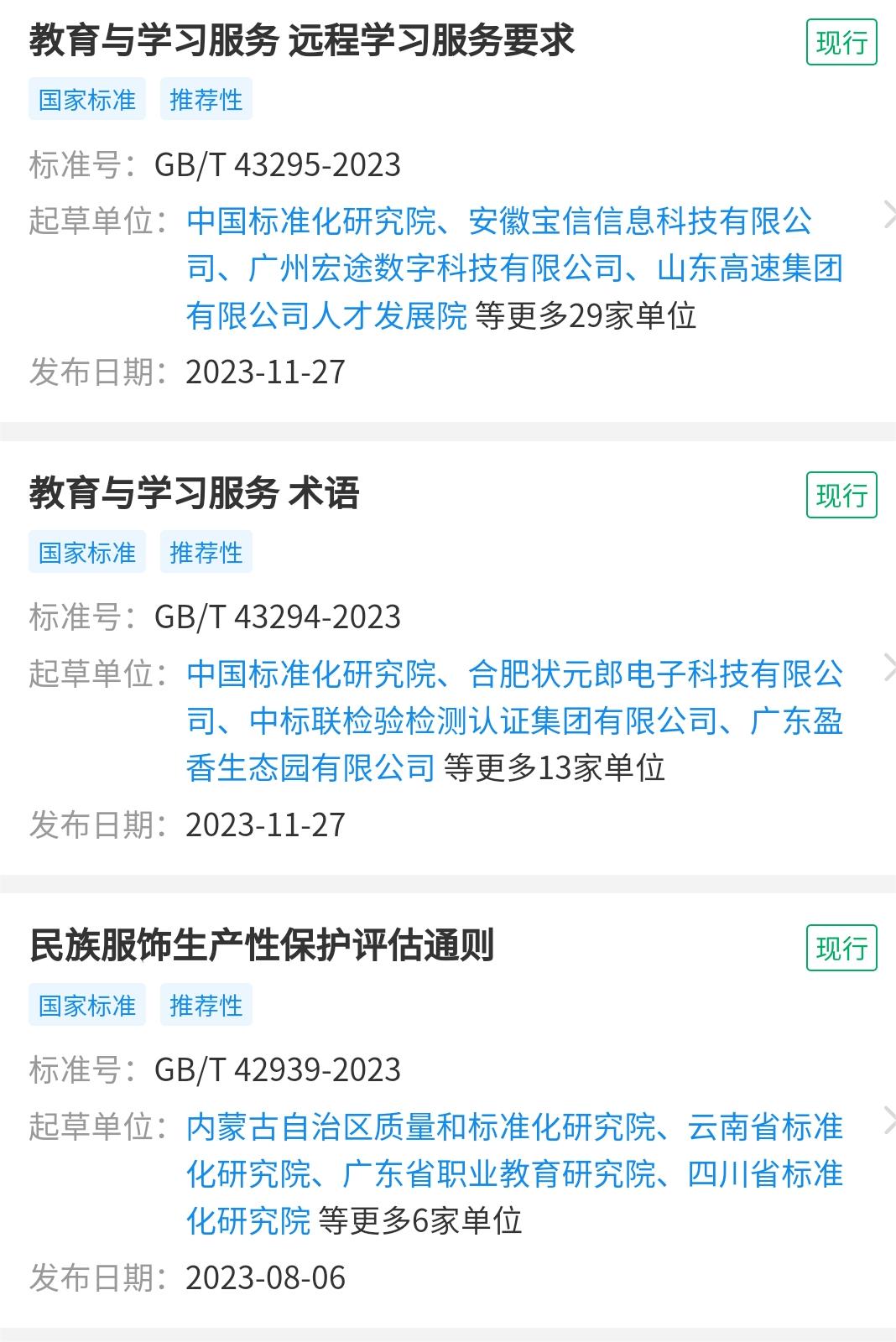 截止至2023年11月,服装艺术系专业带头人宋泮涛参与发行国家标准三项。《民族服饰生产性保护评估通则》标准号:GB/T 42939—2023,《教育与学习服务 术语》标准号:GB/T 43294—2023,《教育与学习服务 远程学习服务要求》标准号:GB/T 42295—2023。