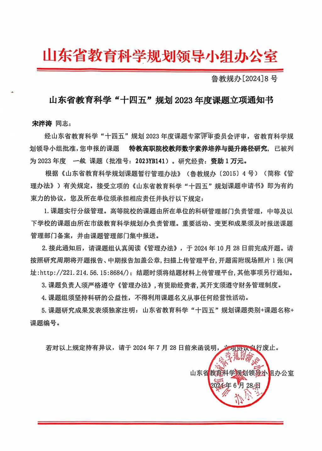 服装艺术系专业带头人宋泮涛主持的山东省教育科学“十四五”规划2023年度课题《特教高职院校教师数字素养培养与提升路径研究》,经专家评审委员会评审,于2024年6月份成功立项。