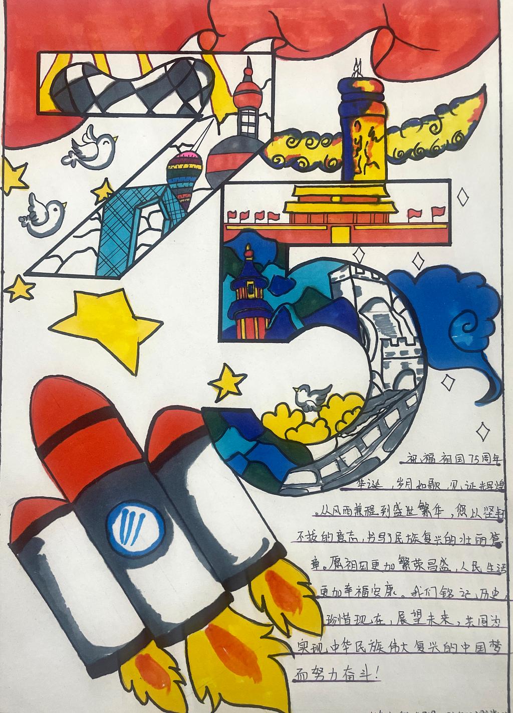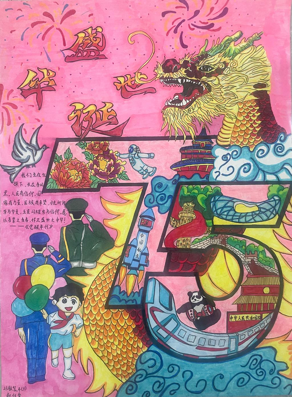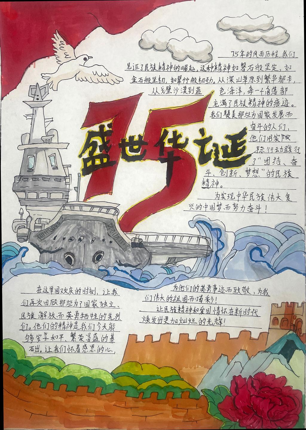活动中同学们纷纷发挥自己的想象力和创造力,积极投入到手抄报的制作当中。他们围绕庆祝新中国成立75周年这一主题,精心设计版面,用五彩斑斓的画笔描绘出祖国的壮丽山河,如雄伟的长城、奔腾的黄河等,这些画作栩栩如生,仿佛将祖国的大好河山搬到了手抄报上。同时,用深情的文字表达对祖国的热爱与祝福,有的讲述新中国成立75年来在科技领域的巨大突破,如从航天事业的飞速发展到5G技术在全球的领先地位;有的展示中国共产党人的历史使命、强国实践;有的回忆革命先辈的英勇事迹,字里行间都洋溢着对祖国母亲深深的敬意。学生在手抄报展览中,互相学习,通过这种方式,能够直观地理解和感受党的历史和精神。