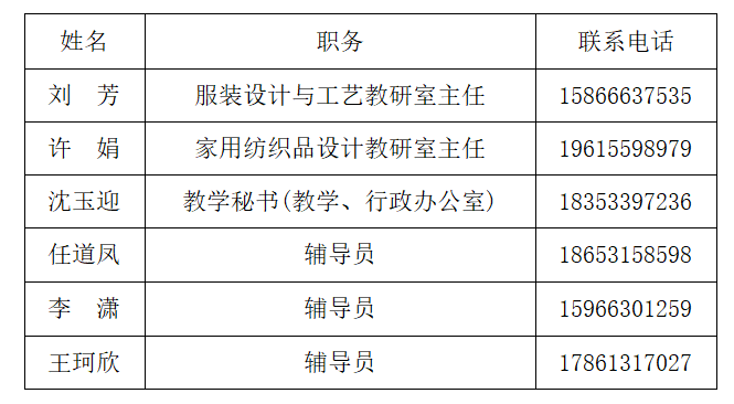 服装艺术系现有党支部书记1人,系副主任1人,专业带头人1人。下设服装设计与工艺教研室、家用纺织品设计教研室等机构。