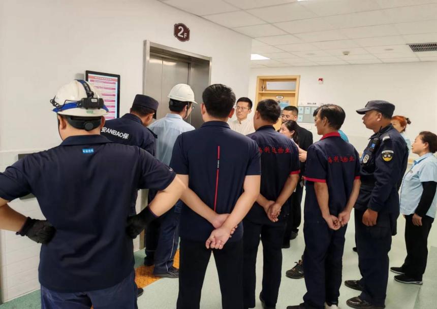 电梯维保公司的救援、物业、安保人员第一时间抵达现场,在电梯口设置警戒标识,防止无关人员靠近。同时通过多方对讲与“被困人员”保持联系,了解“被困人员”的身体状况和情绪状态。