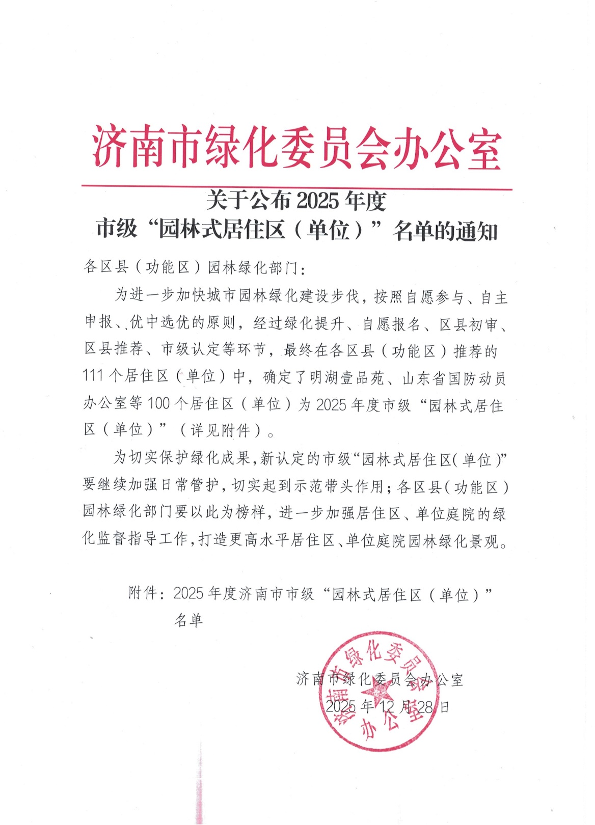 近日,济南市绿化委员会办公室印发《关于公布2025 年市级 “园林式居住区(单位)” 名单的通知》,我院成功获评 2025 年度市级 “园林式居住区(单位)”。这一荣誉经过了区县初评、市级复核等严格评审,是对我院校园绿化景观建设和生态校园建设工作的高度认可。