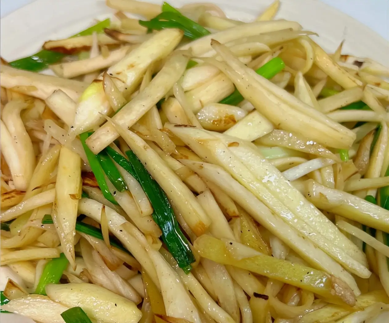 3.接着起锅烧油,姜蒜下锅,下茭白翻炒,加小葱段。