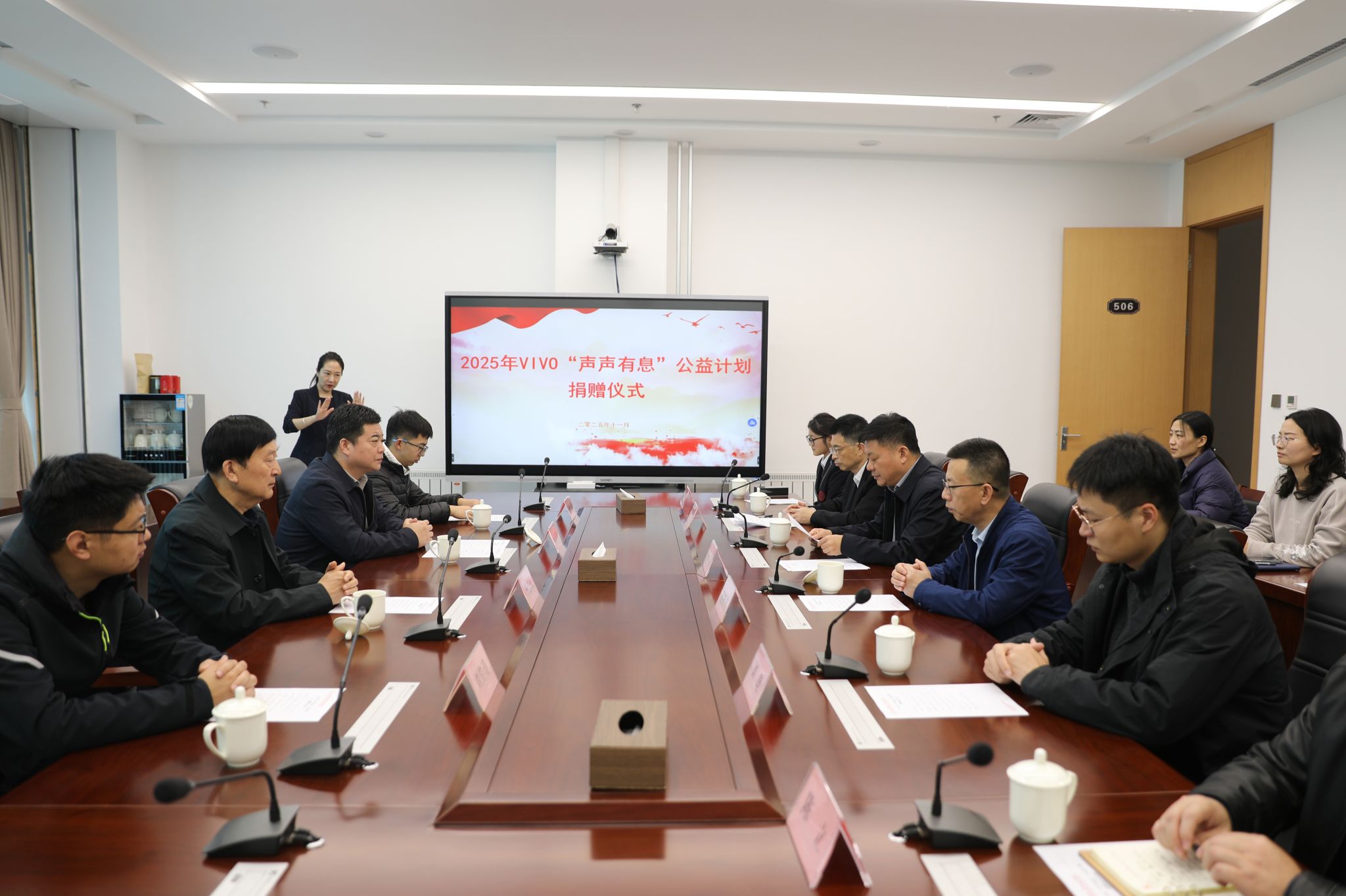 11月11日上午,山东省残疾人福利基金会走进学院,举行vivo“声声有息”公益计划无障碍手机捐赠仪式。学院党委书记杨磊,山东省残疾人福利基金会理事长杨忠民,滨州医学院特殊教育与康复学院常务副院长宿振国,以及2025级听障学生代表参加活动。仪式由学院副院长丁华主持。