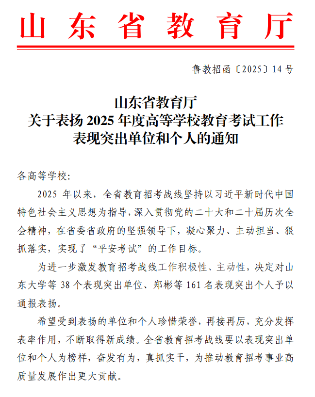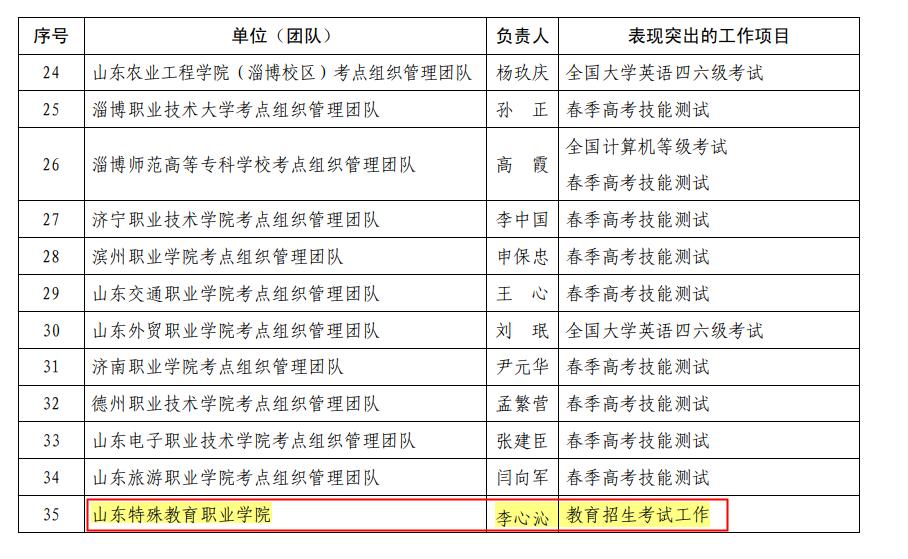近日,山东省教育厅下发《关于表扬2025年度高等学校教育考试工作表现突出单位和个人的通知》(鲁教招函〔2025〕14号),对在2025年度高等学校教育考试工作中表现突出的单位和个人予以通报表扬。由学院院长李心沁负责的山东特殊教育职业学院团队获得“考试组织工作表现突出单位(团队)”荣誉称号。