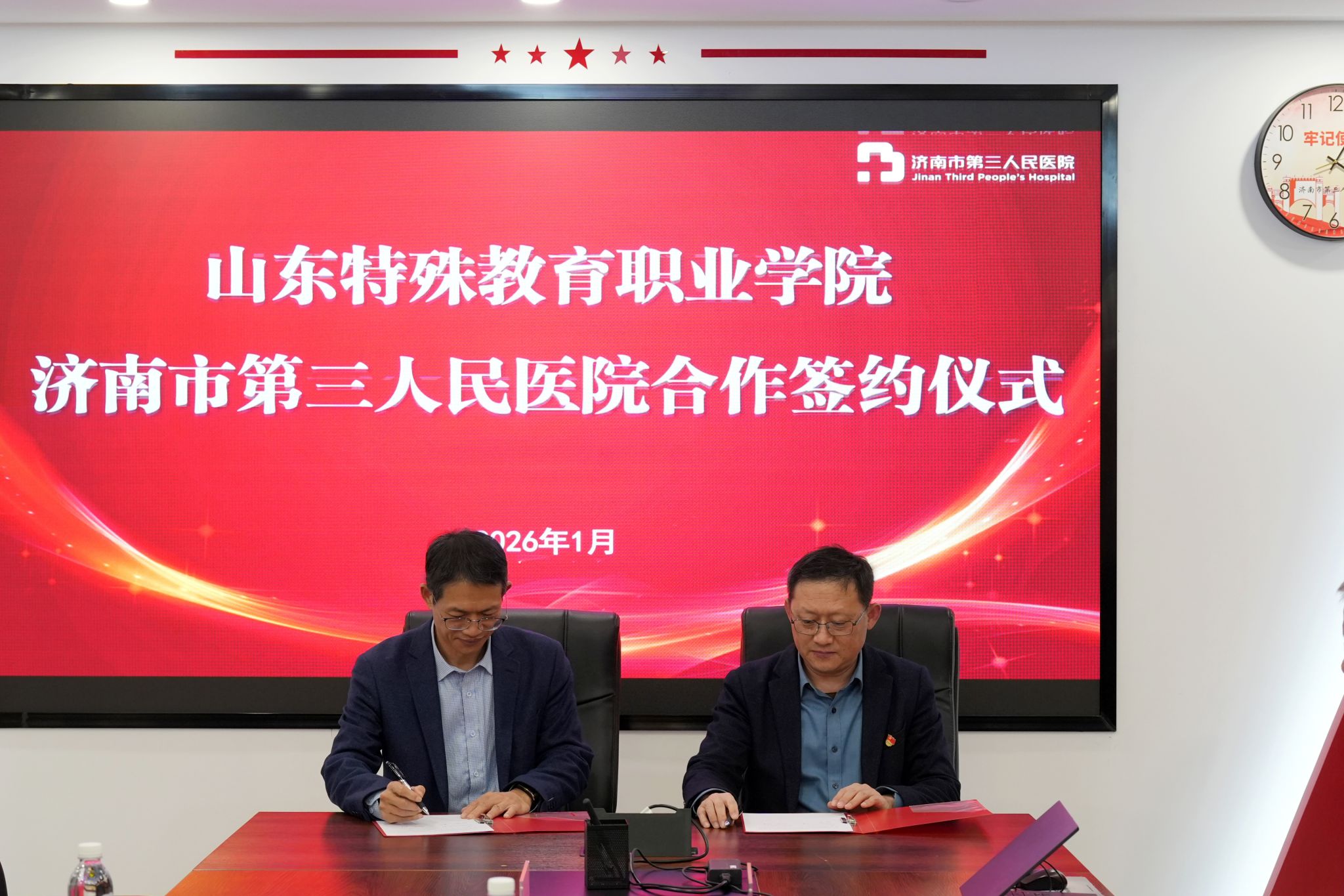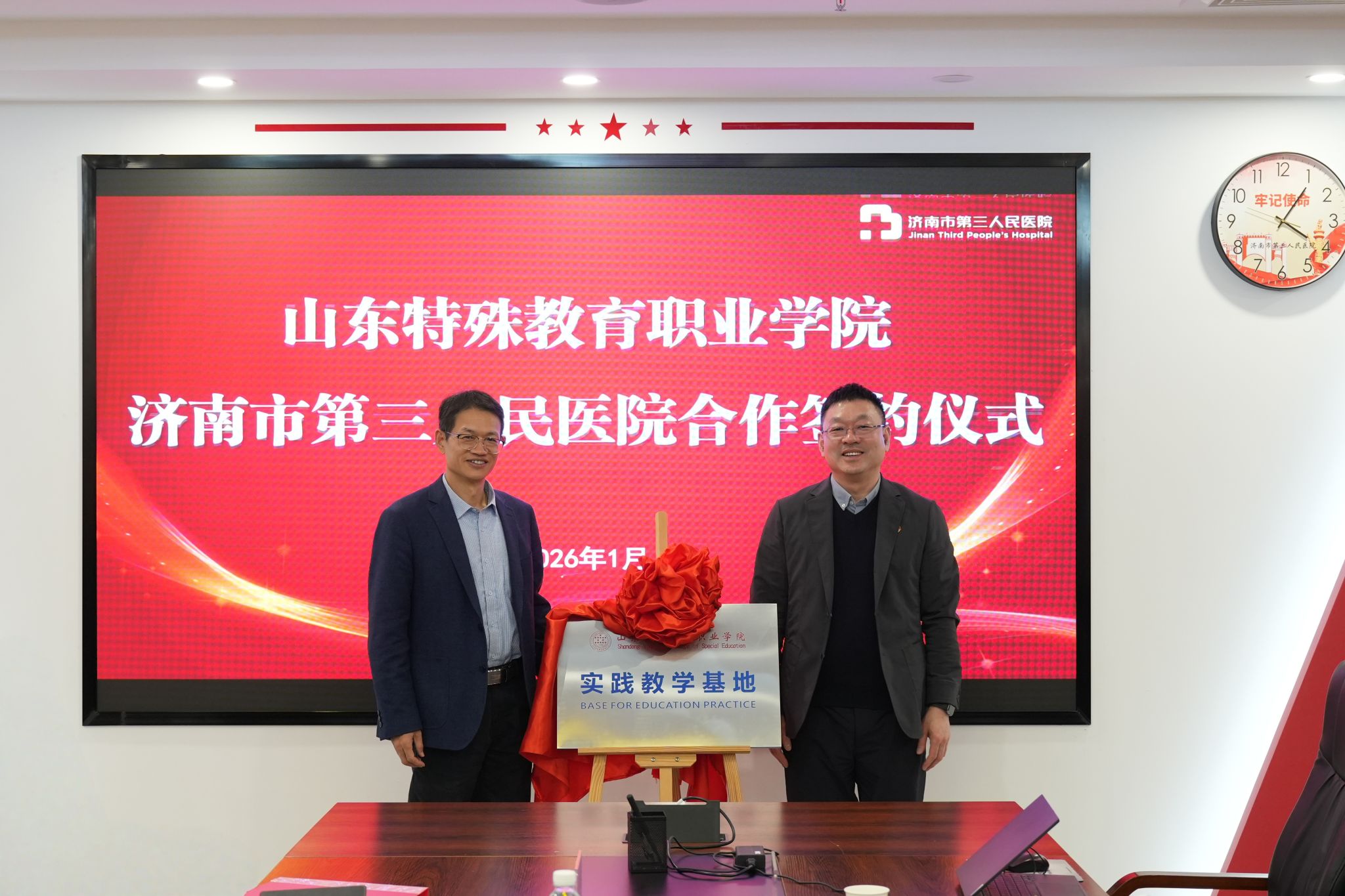 1月14日,学院赴济南市第三人民医院签订合作协议并举行实践教学基地挂牌仪式。济南市第三人民医院党委书记王俊峰、院长王业本,副院长魏洪伟、赵学春,学院院长李心沁、副院长顾丽霞参加签约仪式。