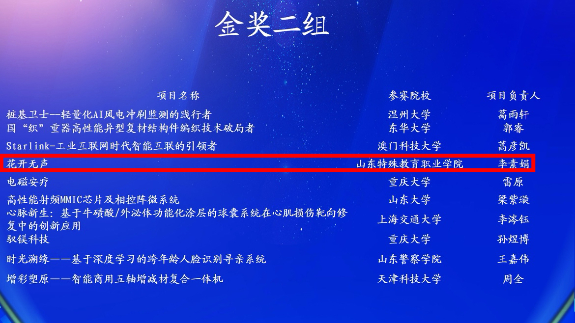 学院“花开无声”项目所在的产业转化组汇聚了来自山东大学、东华大学、上海大学等名校的优质项目,不少参赛团队由硕博领衔,项目已完成从创意到实际效益的跨越,实现成果转化。面对强劲对手,“花开无声”项目团队凭借扎实的技术支撑、清晰的转化路径与显著的社会价值,在路演答辩中展现出过硬的专业素养与创新实力,最终得到评委专家的高度认可,成功摘得金奖。