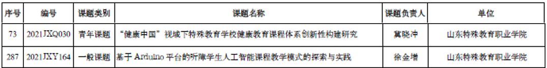 近日,山东省教育科学研究院公布了2021年度山东省教育教学研究课题立项名单,学院《“健康中国”视域下特殊教育学校健康教育课程体系创新性构建研究》《基于Arduino平台的听障学生人工智能课程教学模式的探索与实践》2项课题获批立项。