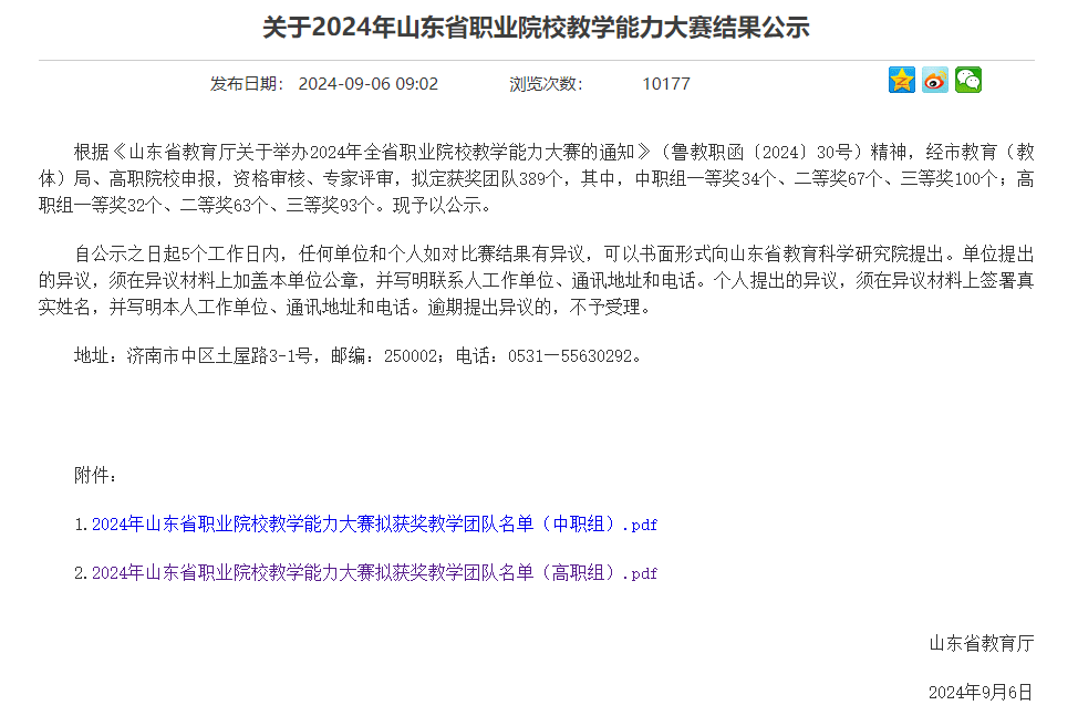 山东省职业院校教学能力大赛由山东省教育厅主办,是省内职业院校规模最大、水平最高的教师教学竞赛,对全面提升全省职业院校教师师德践行能力、专业教学能力、数字素养水平、综合育人能力和自主发展能力,打造高水平、结构化教师教学创新团队具有重要作用。本次比赛共拟定获奖团队389个,其中,高职组一等奖32个、二等奖63个、三等奖93个。