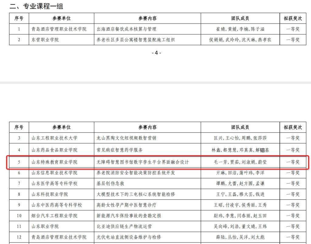 9月6日,山东省教育厅发布《关于2024年山东省职业院校教学能力大赛结果公示》,学院信息技术系毛一芳、贾茹、刘淑娟、蔚莹教学团队作品《无障碍智慧图书馆数字孪生平台界面融合设计》荣获高职专业课程一组一等奖。