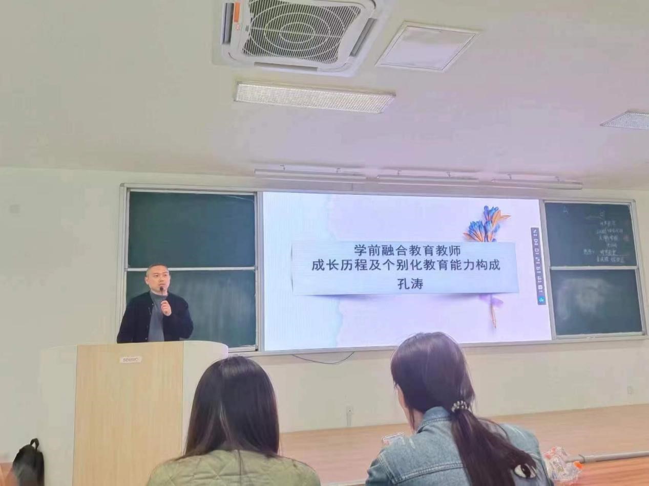 为进一步贯彻《山东省“十四五”特殊教育发展提升行动方案》,积极应对融合教育趋势,推进系部融合教育教学和研究事业的发展,提升师生融合教育实践素养,根据教育康复高水平专业群建设规划,特殊教育系邀请济南市锦屏幼教集团锦屏幼儿园资深融合教育教师孔涛来我系开展讲座。