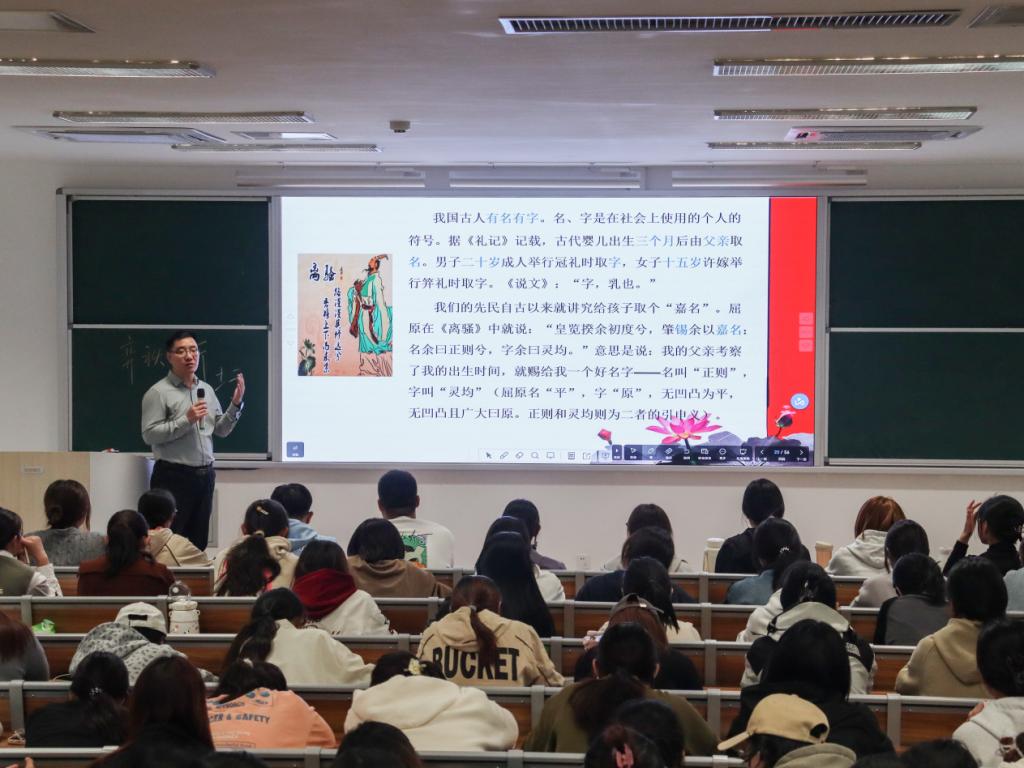 王其和教授以其深厚的学术底蕴和丰富的研究经验,从“古代的姓氏”“名字里的学问”“名字的文化内涵”等板块,与在场师生深入探讨了中国古代姓名文化的丰富内涵和独特魅力。王其和教授从“姓”与“氏”的概念讲起,以大家耳熟能详的古装影视剧和古代名人为例,深入浅出地为同学们讲解了“姓的起源”“姓的作用”“氏”“古代女子的称呼方式”等内容。详细讲解了“名和字的区别”“名与字的关系”“名和字的用途”“避讳”这些古人名字里的学问,揭示了姓名背后的历史故事和文化内涵,让在场听众对古代姓名文化有了更为深刻的认识和理解。在互动环节,王教授耐心解答了同学们提出的关于姓名文化的各种问题,并鼓励大家在日常生活中关注和研究姓名文化,以更好地传承和发扬中华优秀传统文化。