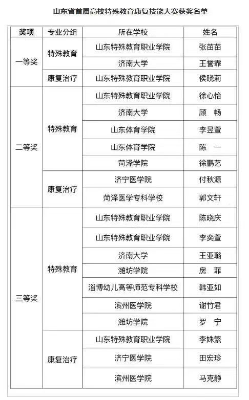 3月31日,由省残联、省教育厅、省卫生健康委联合举办的山东省第二届残疾儿童康复技能大赛暨首届高校特殊教育康复技能大赛落下帷幕。特殊教育系参赛学生在首届高校特殊教育康复技能大赛中取得优异成绩,获得1个一等奖、1个二等奖、2个三等奖。