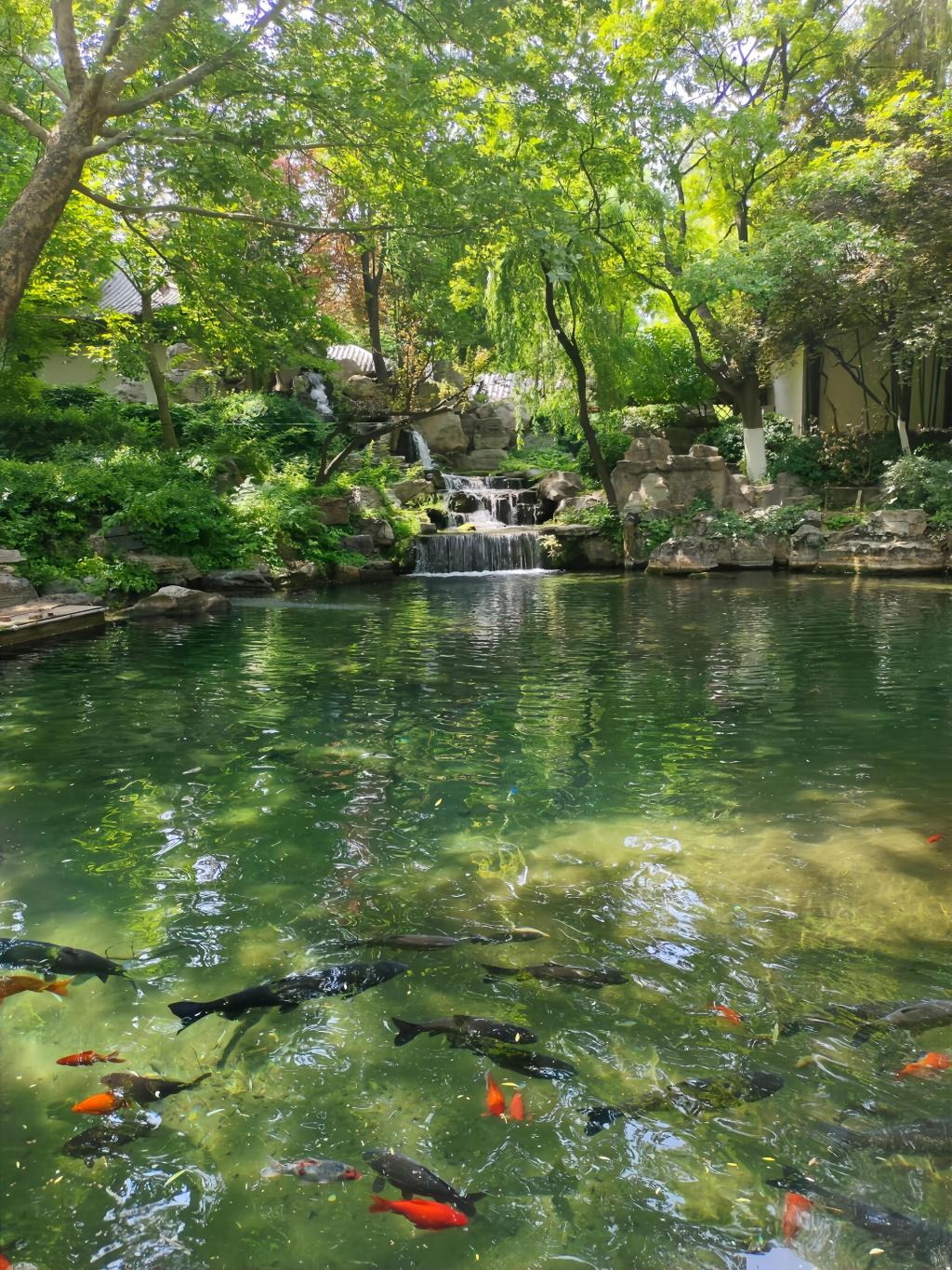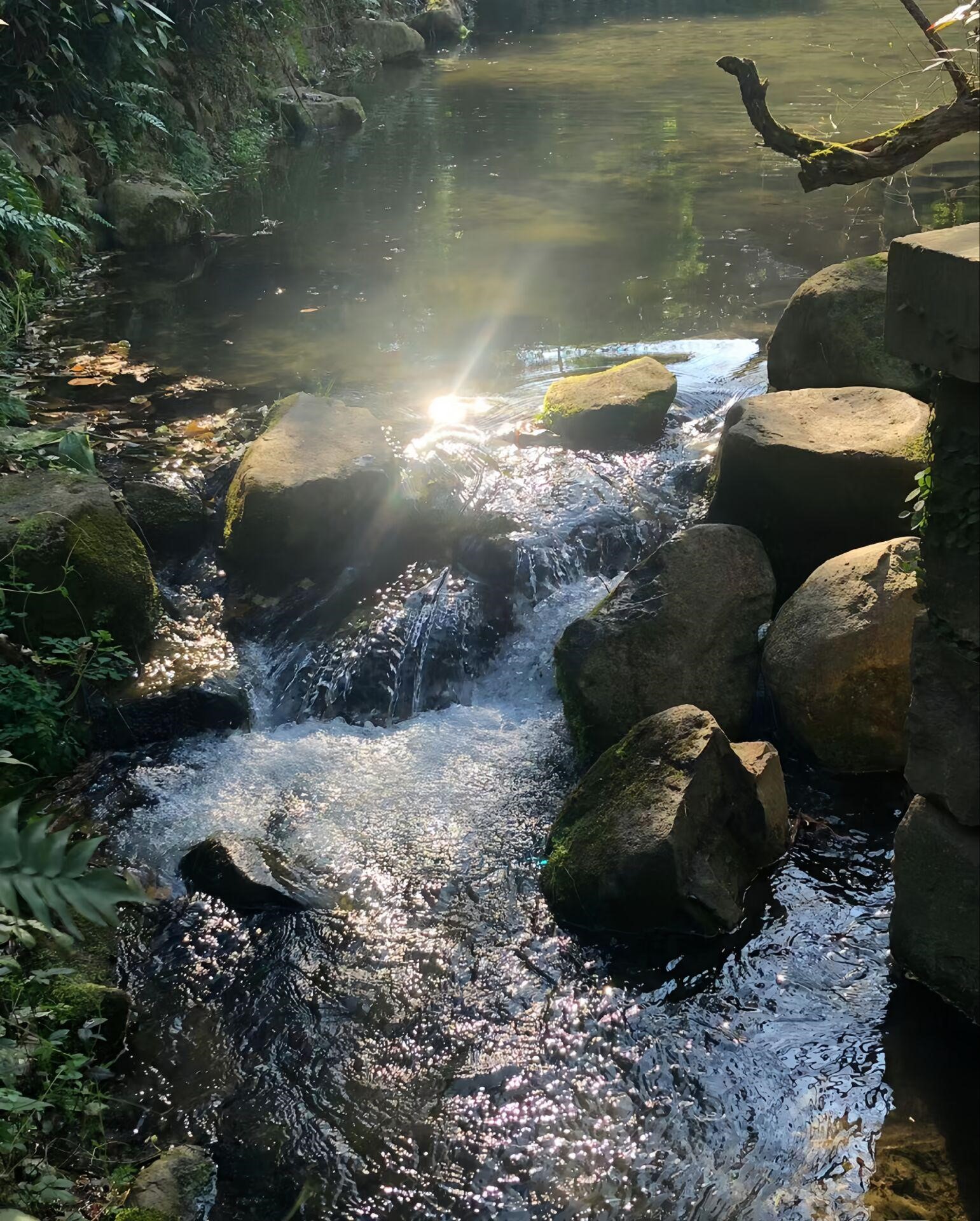 自然中的清泉从错落有致的小石上面缓缓流淌,潺潺的溪水伴着鱼儿荡向远方,恰逢阳光正好。锦鲤们围在一起、或在嬉戏或在争抢鱼食,水的波纹荡起阵阵涟漪。悠然的河水清澈见底,漂亮的小鹅在水面游动,划出层层清波。