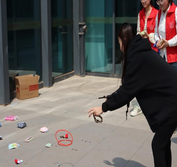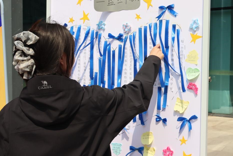 了解了孤独症相关内容后,学院师生在学生会成员的引导下,在爱心卡片写下祝福并粘贴在爱心墙上拍照留念,或是在横幅上签名,以此响应蓝色号召,积极参与蓝色行动。同时,活动现场还举办了“以爱之名,步步为赢”为主题的知识竞答套圈活动,答对者可领取纪念品,场面十分热闹。