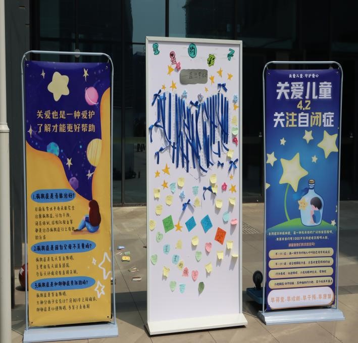活动现场以蓝色为主题色,展出多张与孤独症相关的宣传科普海报。活动背景板展现了一片深蓝色的星空,点缀着黄色的星星,身穿红色马甲的学生会成员积极向学院师生进行孤独症相关知识的讲解及知识图卡的问答。