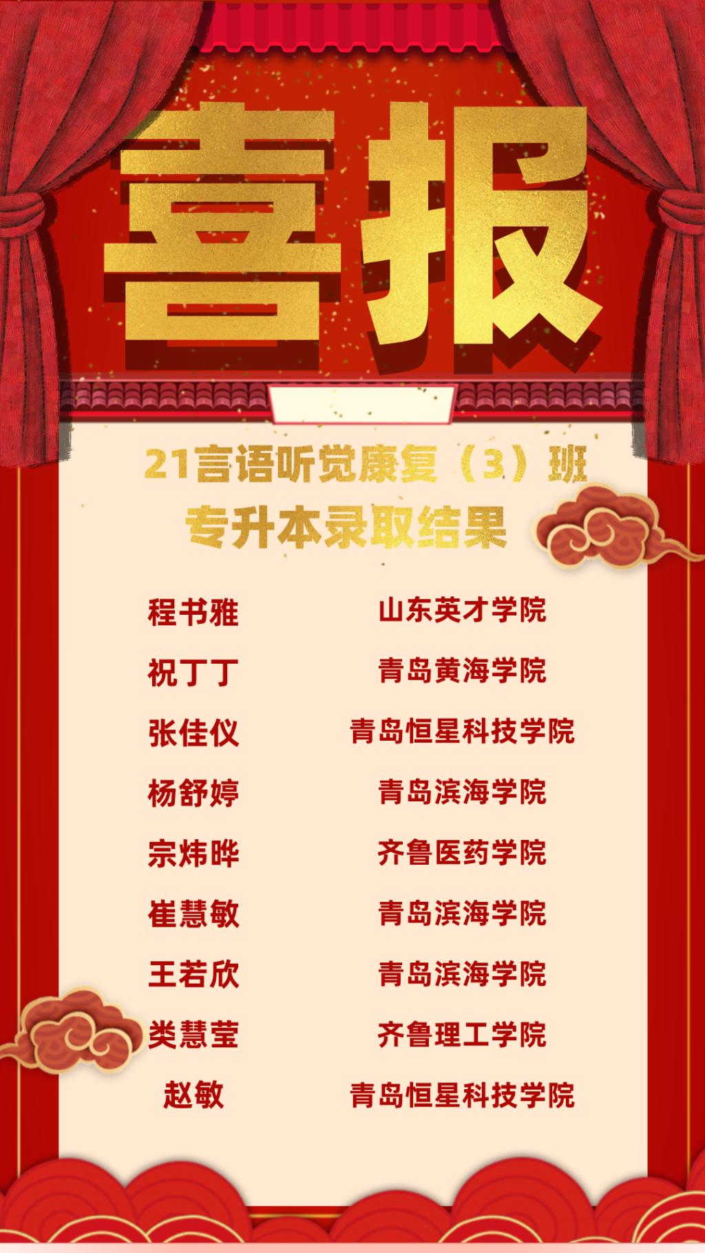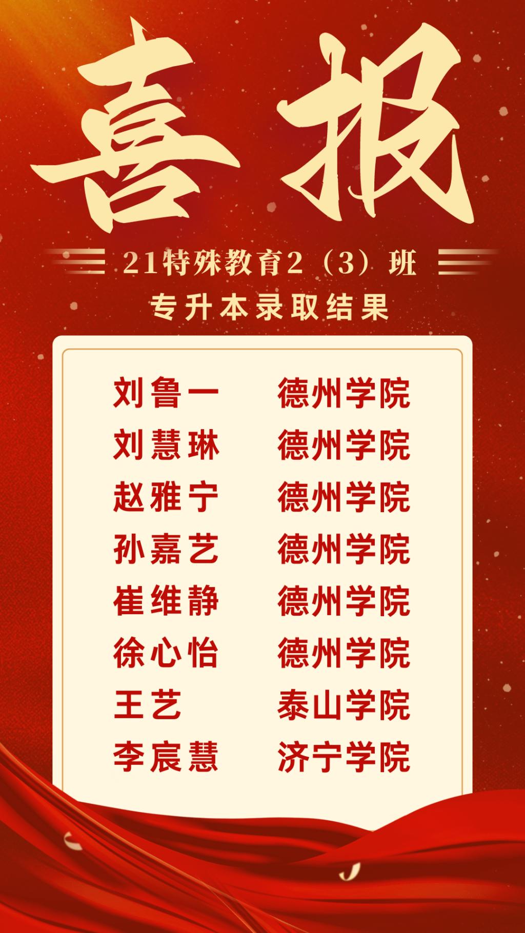 山东省2024年“专升本”招生考试迎来喜讯,特殊教育系2024届毕业生(三年制高职)共有17名同学分别被泰山学院、德州学院、济宁学院、齐鲁医药学院、青岛黄海学院等本科高校录取,其中特殊教育专业录取8人,言语听觉康复技术专业录取9人。