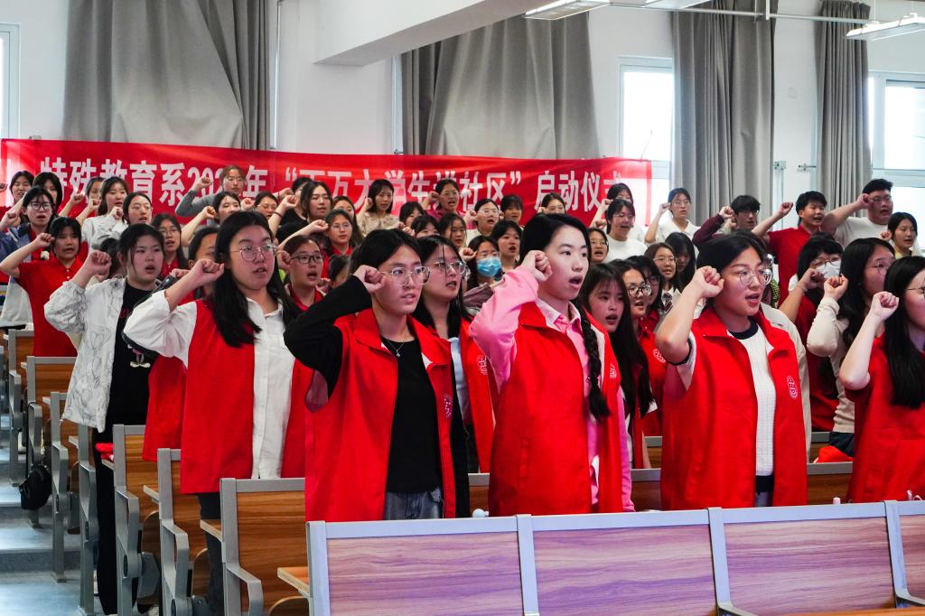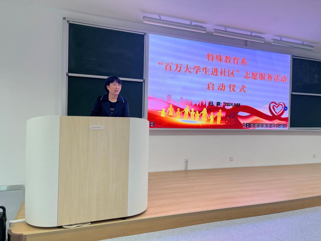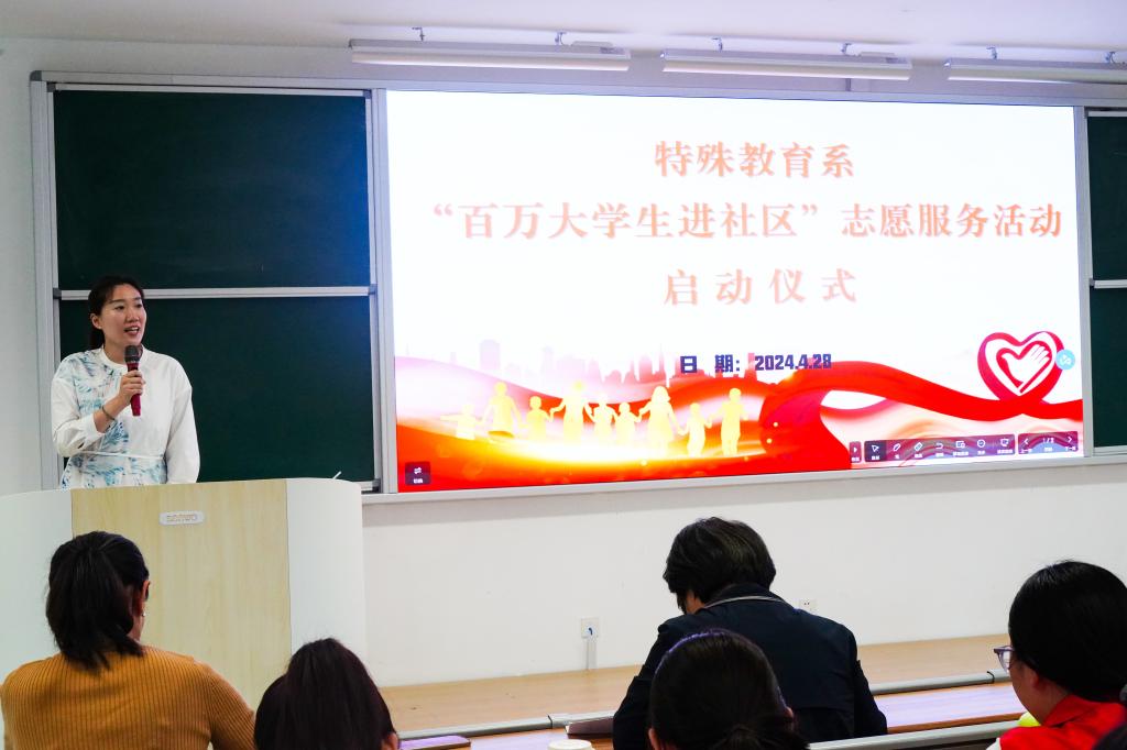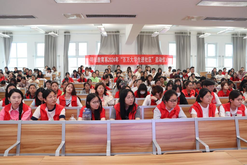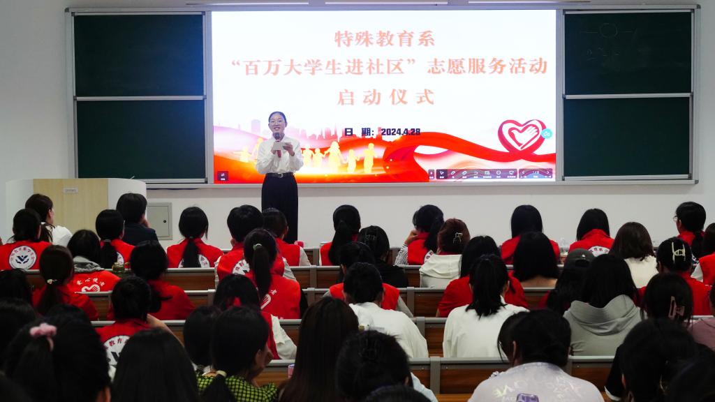 4月28日下午,特殊教育系团总支举行2024年“百万大学生进社区”志愿服务活动启动仪式。学院团委书记、学生工作处处长黄艳华,特殊教育系党支部书记孔嘉颖出席活动,系部辅导员、志愿者代表170余人参加了活动。