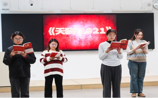此次读书分享会以《天晓:1921》为主线,通过多种形式带领师生们全方位、沉浸式了解中国共产党创建的伟大历程,深切感悟共产党人的初心使命、信仰与信念。在“剧之天晓”环节,同学们自编自导自演的《红岩》《陈望道与<共产党宣言>》《铁血魂》三个话剧片段将活动推向高潮。舞台上,演员们真挚的感情、精彩的对白、精准的人物形象刻画、极具感染力的动作与默契的配合,展现出革命年代最激昂的风采,让现场观众为之动容。