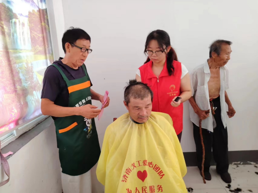 为切实解决老年人外出不便,落实“我为家乡做实事”的实践精神,团队成员自行联系济南义务理发团队志愿者为村里老年人开展公益剪发活动。同学们跟随师傅们耐心学习虚心请教,从谨慎落剪到轻车熟路,不一会儿爷爷奶奶们的满头银发便“焕然一新”。在理发的过程中,团队成员操着家乡话与老人们聊天、说笑,其乐融融。一把剪刀,一个微笑,此次义务理发,不仅为行动不便的老人们解决了“头”等大事,更为他们带去了关心、关爱与关怀,营造了浓厚的敬老爱老氛围。