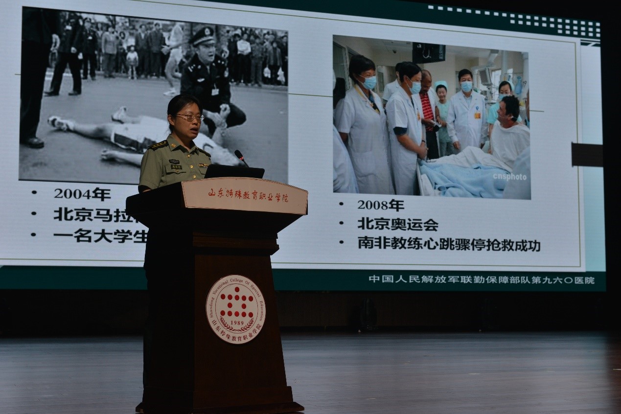 第960医院急诊科副主任医师仲薇薇向同学们详细介绍了心肺复苏的具体操作流程,并进行了现场演示,提高了学生对于心肺复苏等急救方法的认识,还学会了简单的应急救护知识。