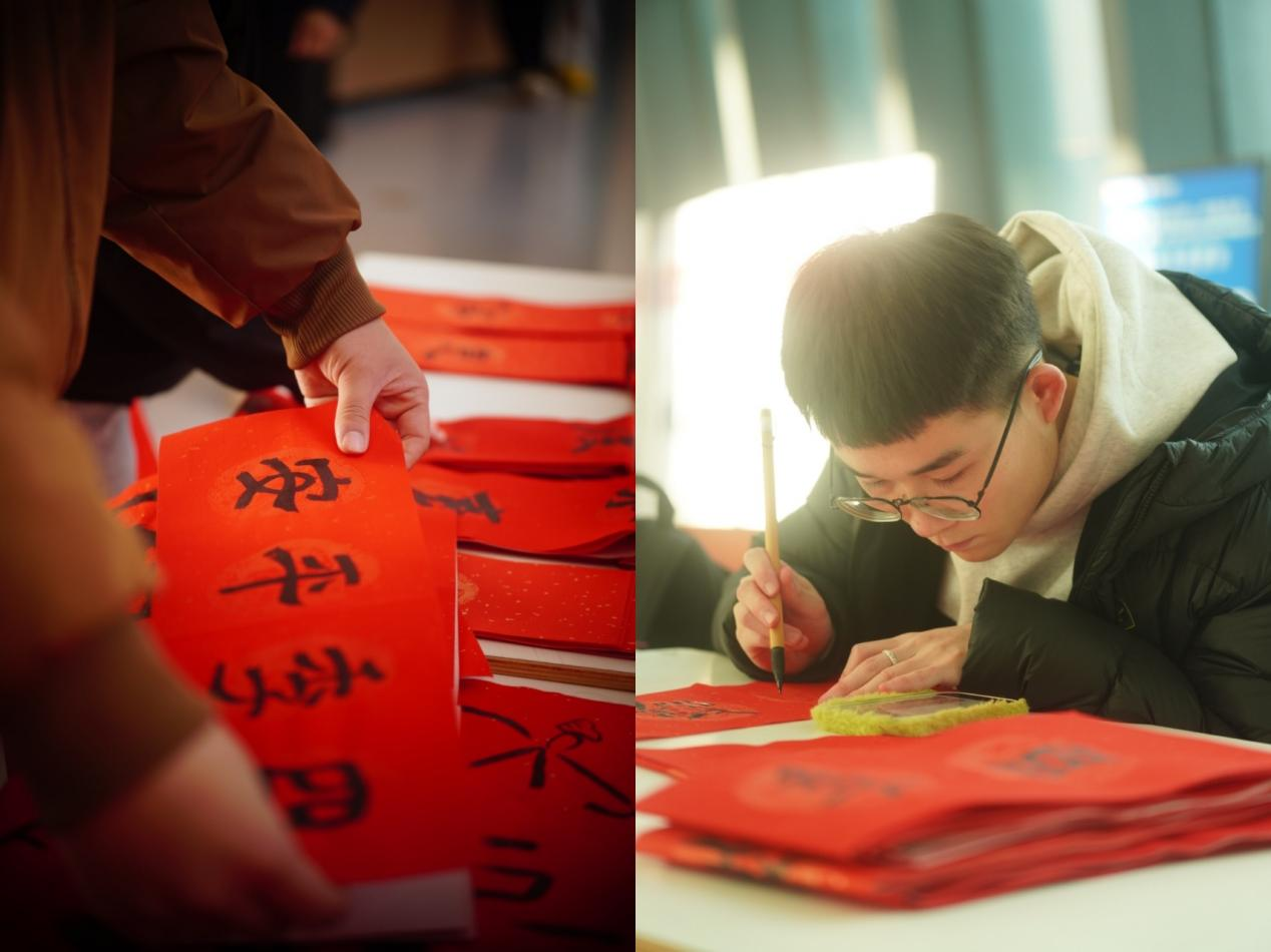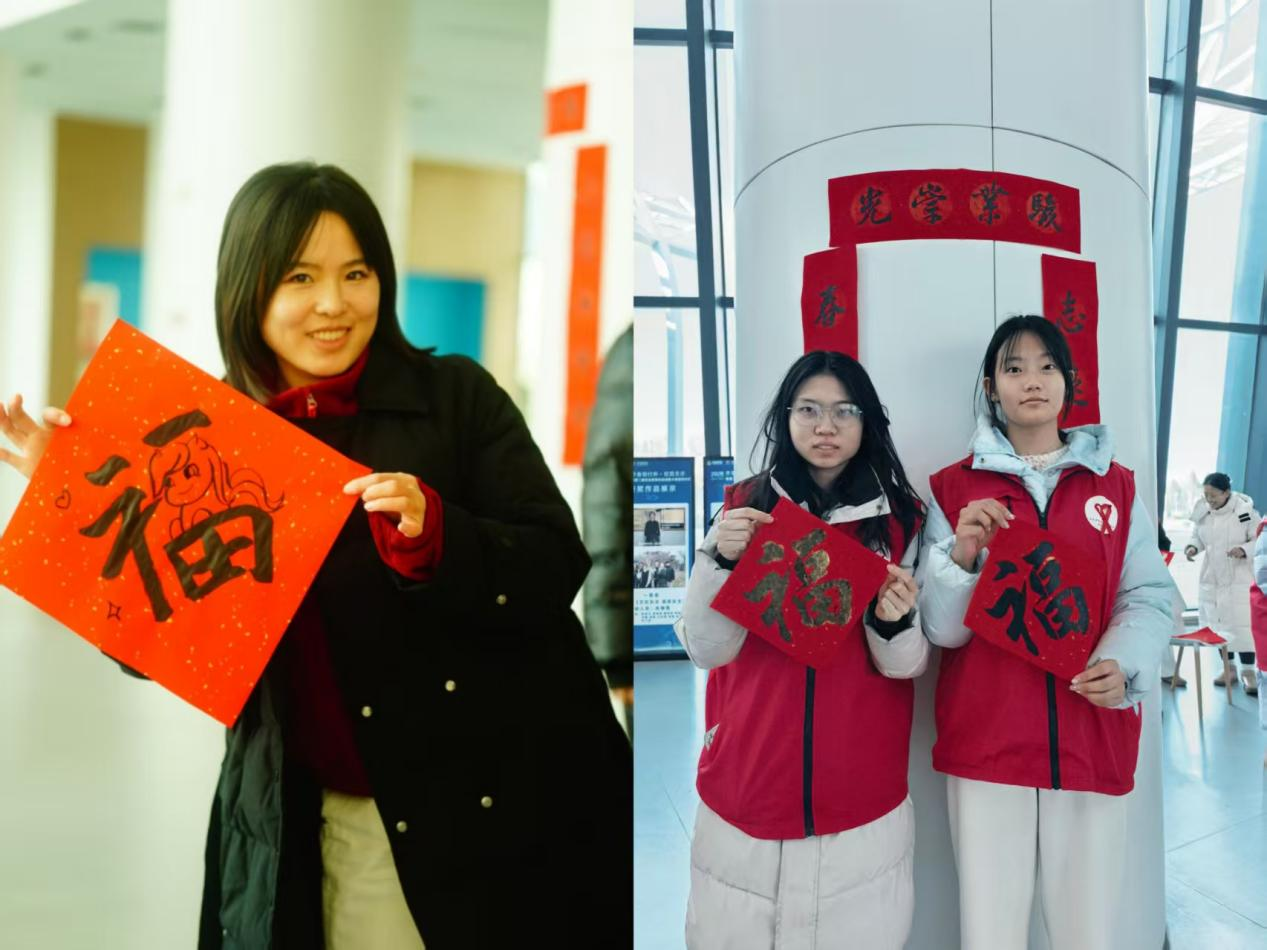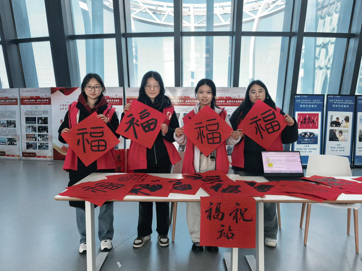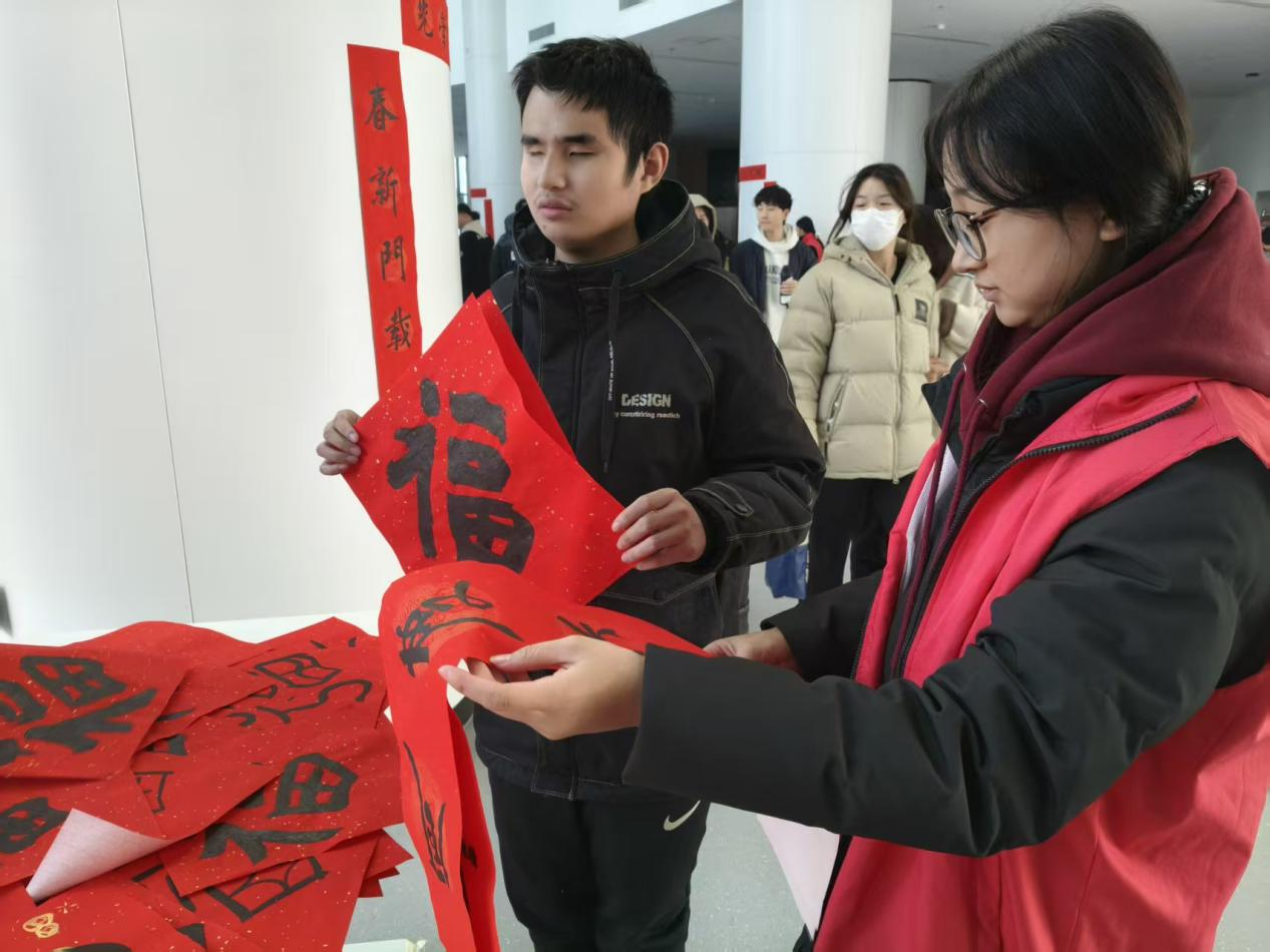 活动现场设立专属“祝福站”,为特殊学生群体提供贴心帮扶。听障学生以手语编排祝福、现场展示,视障学生录制新年祝福、一展歌喉,完成即可兑换福礼。志愿者全程一对一协助,让每一位参与者都能感受温暖与喜悦。摄影组全程跟进拍摄,定格下笔墨创作的精彩瞬间与师生领福的喜悦笑颜。