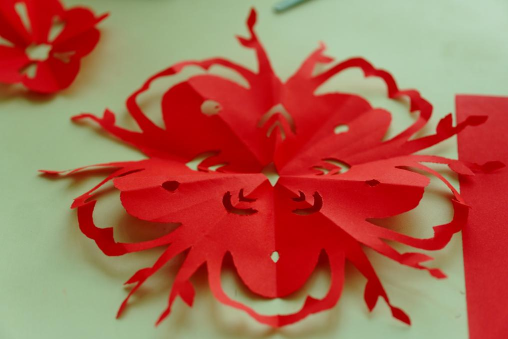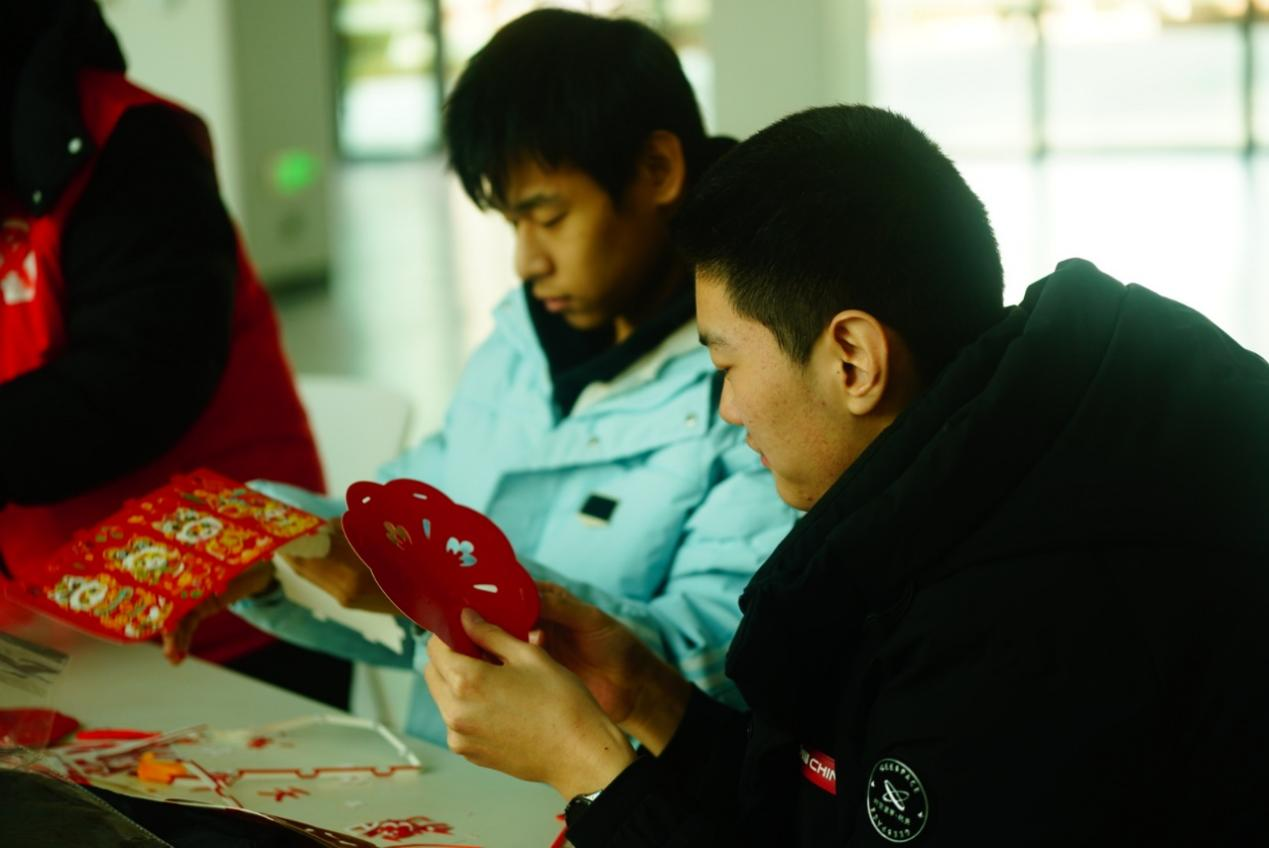 剪纸体验区里,红纸铺展、剪刀起落,师生们尽情发挥创意巧思,精心裁剪出迎年纳福的剪纸作品,在指尖创作中感受传统剪纸技艺的匠心巧思与独特魅力。