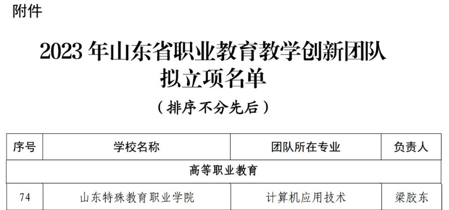 近日,山东省教育厅发布《关于2023年山东省职业教育教学创新团队遴选结果的公示》,我系申报的“计算机应用技术”教学团队入选2023年山东省职业教育教学创新团队。
