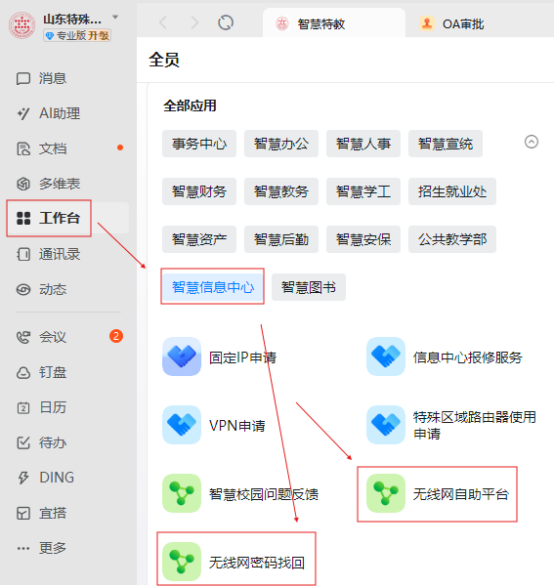 登录钉钉工作台,依次点击"智慧信息中心"-"无线网密码找回"模块,输入钉钉注册的手机号,密码将通过短信发送至预留手机号码。