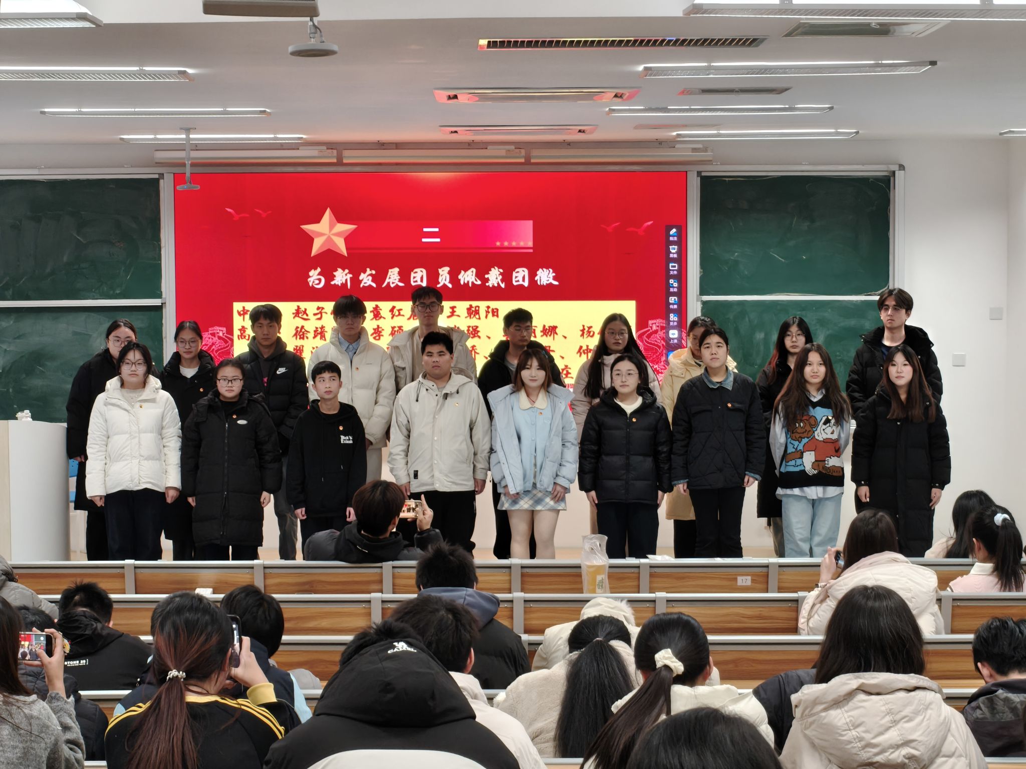 王涵宣读 2025 年度新发展团员名单,赵子恒、袁红晨、王朝阳等 18 名同学光荣入选。随后,系团总支组织委员任子豪、宣传委员石欣悦为新团员代表郑重佩戴团徽,熠熠生辉的团徽承载着共青团的光荣使命,让新团员深切体悟到身份的荣誉感与责任的厚重感。