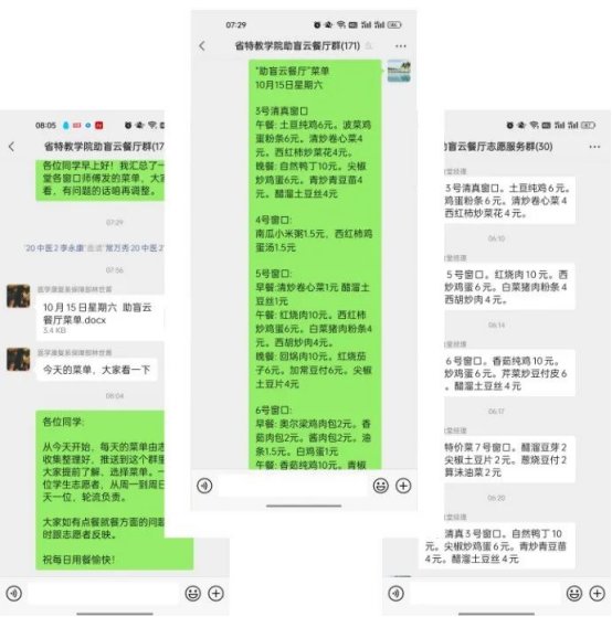 视障学生,特别是全盲生,因看不到食堂菜品和价格,需要在每个摊位询问师傅,点餐耗费时间久。有时为了便利,部分视障学生不愿逐个摊位询问,直接凭经验点餐,经常错过美食,特别是新上的菜品。 据调查,学院全体视障学生均使用智能手机。借助VoiceOver、TalkBack等手机自带的读屏工具,绝大多数视障学生能比较流畅地使用各种社交软件,较为方便地获取和使用信息。 基于此,学院医学康复系和后勤管理处联合推出“助盲云餐厅”志愿服务。每天早上6点30分之前,后勤管理处组织各摊位师傅把全天的供餐明细价格发到“助盲云餐厅”志愿服务微信群,新上菜品特别标出,由学生志愿者整理、发送到视障学生微信群,让视障学生提前通过读屏了解菜单,精准选择。