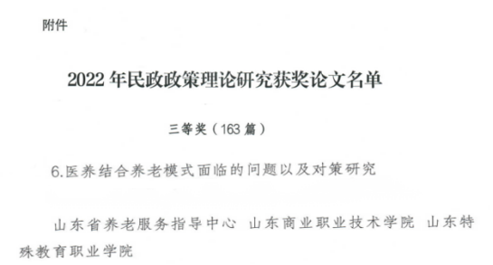 近日,民政部发布《关于2022年民政政策理论研究获奖情况的通报》(民函[2022]82号)。我校医学康复系联合山东省养老服务指导中心、山东商业职业技术学院撰写的论文《医养结合养老模式面临的问题以及对策研究》荣获三等奖。