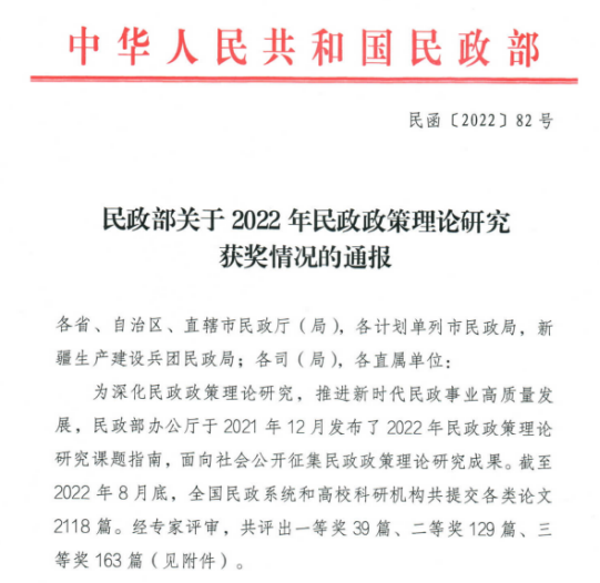 本次民政部共征集民政政策理论研究成果2118篇,经评审获奖政策理论研究成果331篇,其中一等奖39篇、二等奖129篇、三等奖163篇。