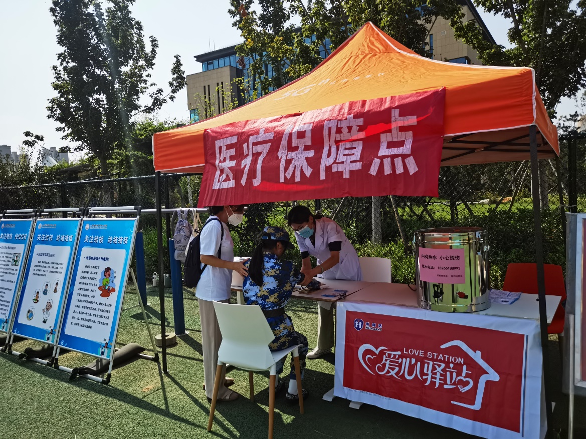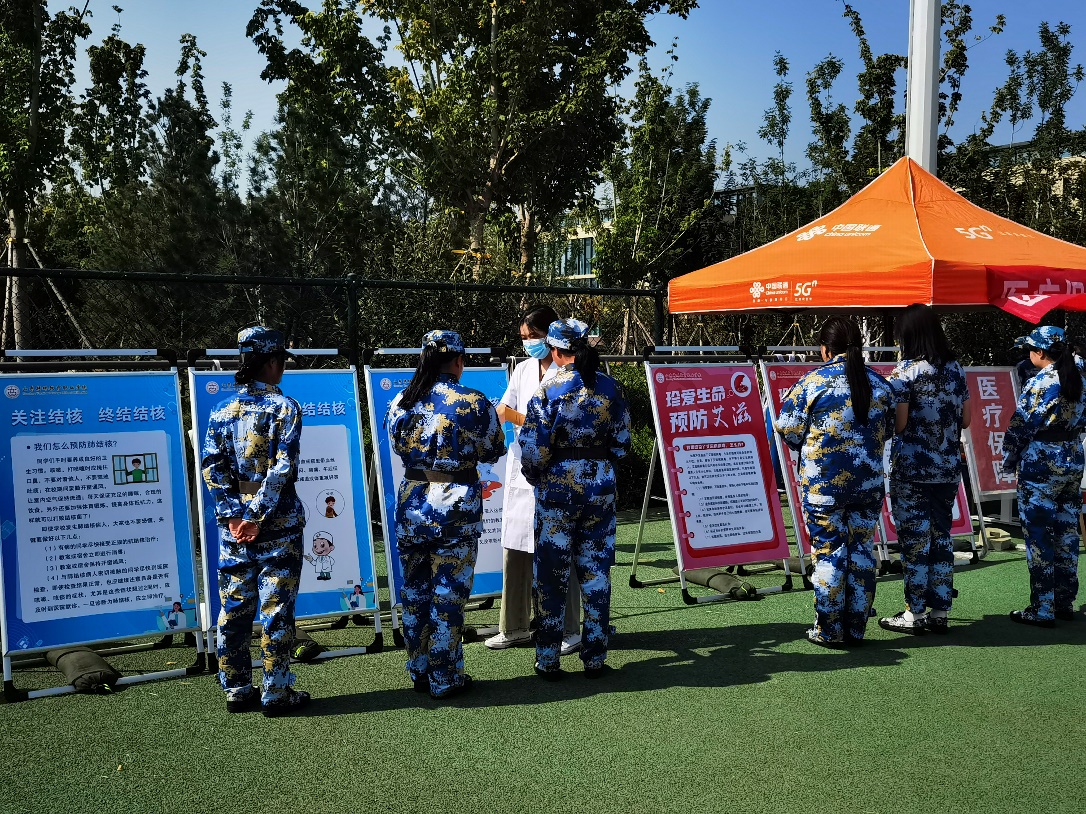 为确保军训安全、顺利开展,门诊部工作人员配齐了中暑、外伤等急救物品,做好应急预案。在军训现场设置了医疗保障点,随时准备为学生提供医疗支持和救护,确保每位军训学生的健康和安全。医疗保障点还摆放了健康知识宣传海报,给学生发放健康教育宣传手册,为学生普及流感、结核病、艾滋病、乙肝等疾病的防控知识,引导学生树立正确的健康观,形成健康的生活方式。
