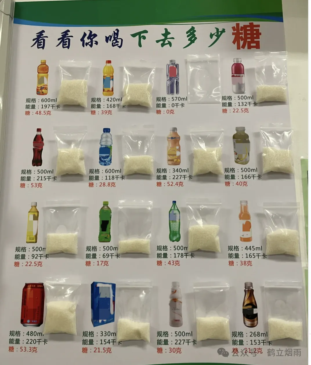 这个糖不是说你肉眼可见的白糖才叫糖,比如很多医院内分泌科都有这个图。很多你以为的健康的或者不健康的饮料里面,都有特别多的你看不见摸不着的糖。