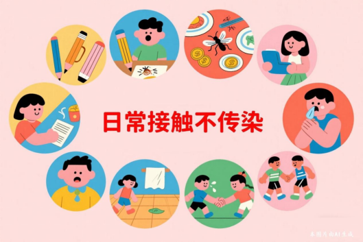 与艾滋病病毒感染者和艾滋病病人的一般日常生活接触不会传播艾滋病。如:握手、拥抱、跳舞、咳嗽、打喷嚏、礼节性接吻,一起进 餐、乘车、学习、郊游、玩耍,共用劳动工具、餐饮用具、办公用品、卫生间、游泳池、电话、钱币等。蚊虫叮咬也不会传播艾滋病。