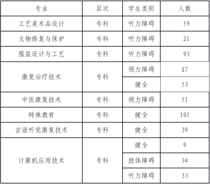 学院紧跟经济社会发展和市场需求,大力加强专业建设,设有5个系,开设工艺美术品设计、文物修复与保护、服装设计与工艺、康复治疗技术、中医康复技术、特殊教育、言语听觉康复技术、计算机应用技术、数字媒体技术9个专业。全国残疾人康复人才培养改革试点专业2个、省级高水平专业群2个、省级品牌专业群2个。