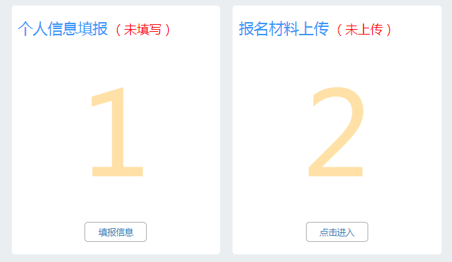 ⑤在方框“1”中,点击【填报信息】按钮,填写报名信息。报名信息填报完成提交后,在方框“2”中点击【点击进入】按钮后,上传电子版报名材料。