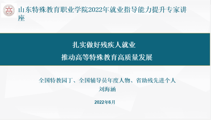 刘海涵书记做了题为《扎实做好残疾人就业,推动高等特殊教育高质量发展》的讲座,她以长春大学特教学院学生就业指导工作为案例,结合自己近20年来从事残疾学生服务管理工作的亲身经历和实践经验,从当前残疾大学生就业形势、影响就业的因素、长春大学特教学院在提升残疾大学生就业方面的具体做法等几个部分,阐述了如何将学生就业指导工作做活、做实、做细。讲座的内容给在场聆听的辅导员、班主任很大的工作启发与指导,讲座中刘书记表现出的对特教事业的执着热爱和对残疾学生的拳拳之心也深深地感动鼓舞着同为特教工作者的辅导员、班主任们,进一步坚定了大家做好残疾学生就业工作的信心。