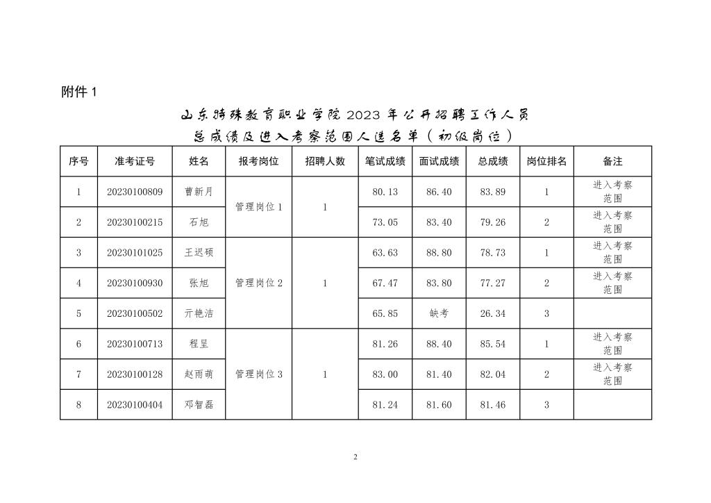 1.山东特殊教育职业学院2023年公开招聘工作人员总成绩及进入考察范围人选名单(初级岗位)